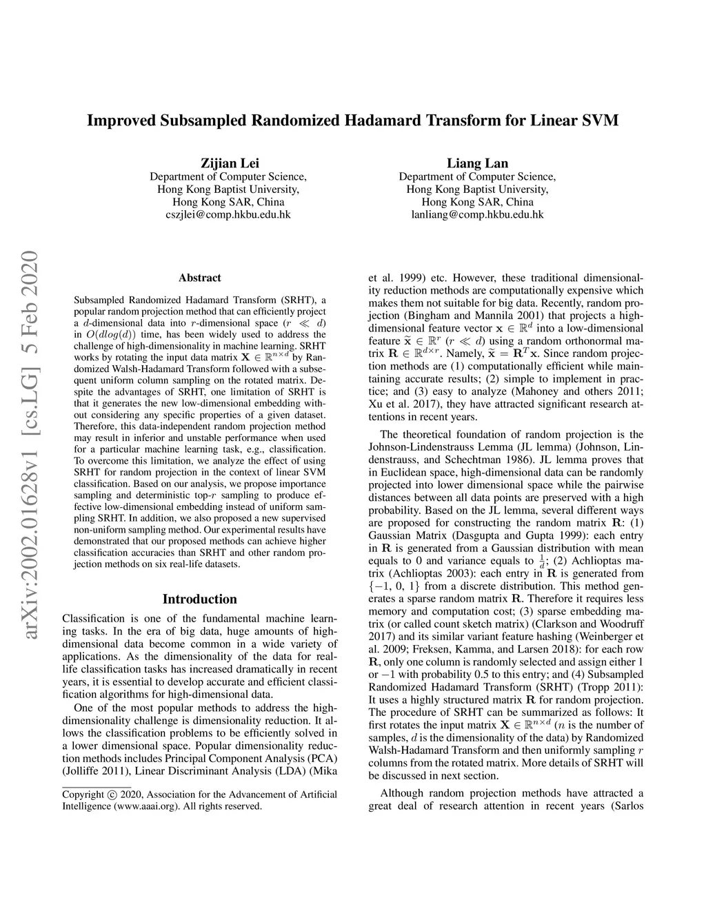 Subsampled Randomized Hadamard Transform (SRHT), a popular random projection method that can efficiently project a -dimensional data into -dimensional space () in time, has been widely used to address the challenge of high-dimensionality in machine learning. SRHT works by rotating the input data matrix by Randomized Walsh-Hadamard Transform followed with a subsequent uniform column sampling on the rotated matrix. Despite the advantages of SRHT, one limitation of SRHT is that it generates the new low-dimensional embedding without considering any specific properties of a given dataset. Therefore, this data-independent random projection method may result in inferior and unstable performance when used for a particular machine learning task, e.g., classification. To overcome this limitation, we analyze the effect of using SRHT for random projection in the context of linear SVM classification. Based on our analysis, we propose importance sampling and deterministic top- sampling to produce effective low-dimensional embedding instead of uniform sampling SRHT. In addition, we also proposed a new supervised non-uniform sampling method. Our experimental results have demonstrated that our proposed methods can achieve higher classification accuracies than SRHT and other random projection methods on six real-life datasets.