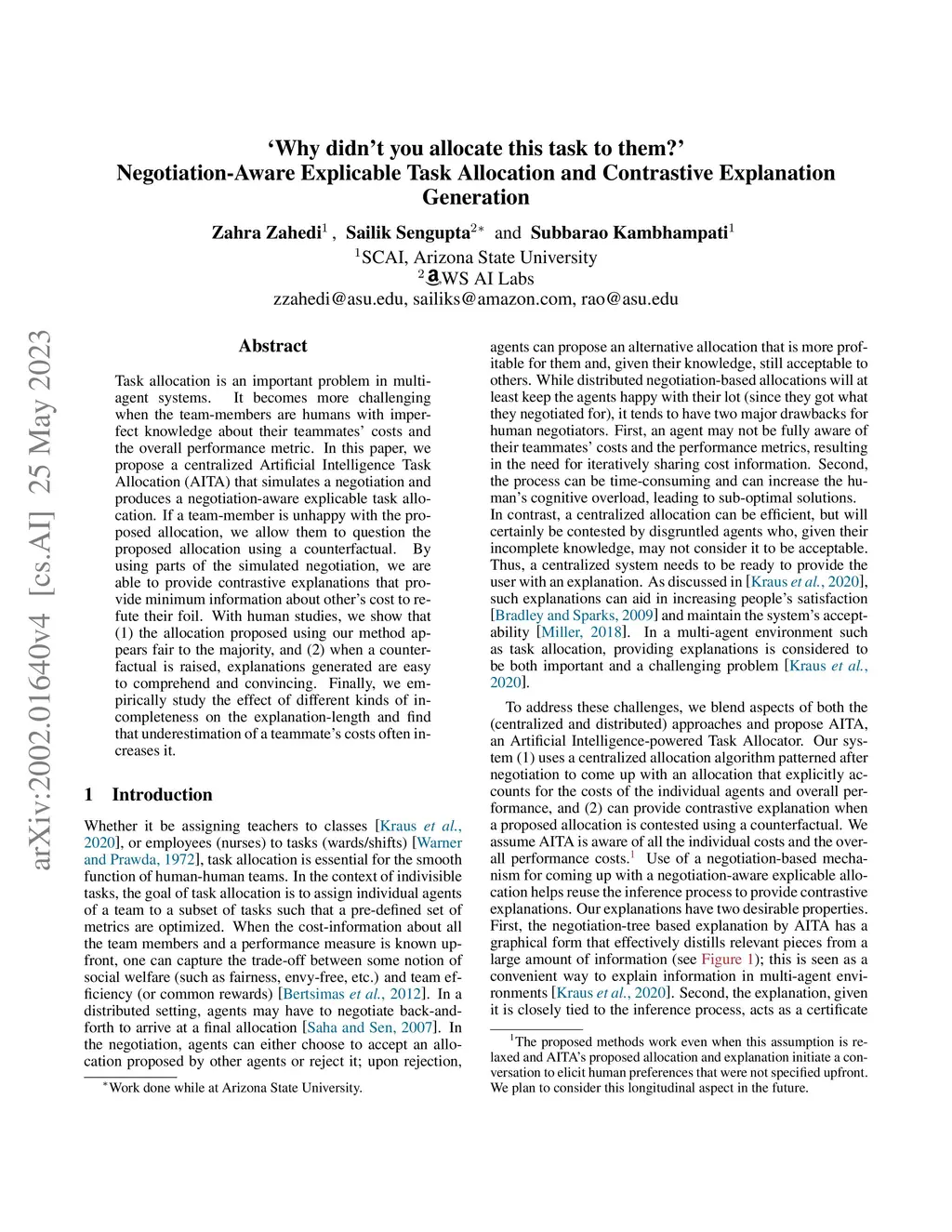Task allocation is an important problem in multi-agent systems. It becomes more challenging when the team-members are humans with imperfect knowledge about their teammates' costs and the overall performance metric. In this paper, we propose a centralized Artificial Intelligence Task Allocation (AITA) that simulates a negotiation and produces a negotiation-aware explicable task allocation. If a team-member is unhappy with the proposed allocation, we allow them to question the proposed allocation using a counterfactual. By using parts of the simulated negotiation, we are able to provide contrastive explanations that provide minimum information about other's cost to refute their foil. With human studies, we show that (1) the allocation proposed using our method appears fair to the majority, and (2) when a counterfactual is raised, explanations generated are easy to comprehend and convincing. Finally, we empirically study the effect of different kinds of incompleteness on the explanation-length and find that underestimation of a teammate's costs often increases it.