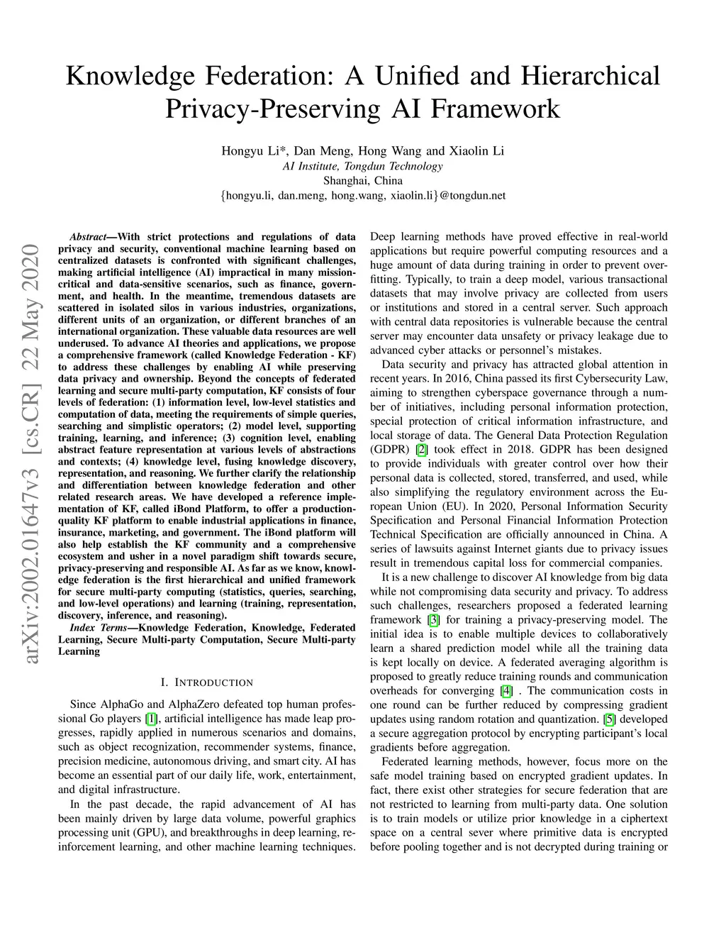 With strict protections and regulations of data privacy and security, conventional machine learning based on centralized datasets is confronted with significant challenges, making artificial intelligence (AI) impractical in many mission-critical and data-sensitive scenarios, such as finance, government, and health. In the meantime, tremendous datasets are scattered in isolated silos in various industries, organizations, different units of an organization, or different branches of an international organization. These valuable data resources are well underused. To advance AI theories and applications, we propose a comprehensive framework (called Knowledge Federation - KF) to address these challenges by enabling AI while preserving data privacy and ownership. Beyond the concepts of federated learning and secure multi-party computation, KF consists of four levels of federation: (1) information level, low-level statistics and computation of data, meeting the requirements of simple queries, searching and simplistic operators; (2) model level, supporting training, learning, and inference; (3) cognition level, enabling abstract feature representation at various levels of abstractions and contexts; (4) knowledge level, fusing knowledge discovery, representation, and reasoning. We further clarify the relationship and differentiation between knowledge federation and other related research areas. We have developed a reference implementation of KF, called iBond Platform, to offer a production-quality KF platform to enable industrial applications in finance, insurance et al. The iBond platform will also help establish the KF community and a comprehensive ecosystem and usher in a novel paradigm shift towards secure, privacy-preserving and responsible AI. As far as we know, knowledge federation is the first hierarchical and unified framework for secure multi-party computing and learning.
