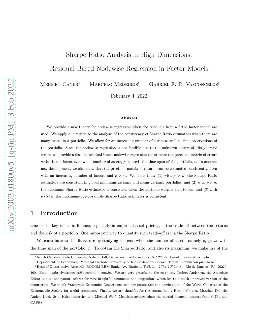 We provide a new theory for nodewise regression when the residuals from a fitted factor model are used. We apply our results to the analysis of the consistency of Sharpe ratio estimators when there are many assets in a portfolio. We allow for an increasing number of assets as well as time observations of the portfolio. Since the nodewise regression is not feasible due to the unknown nature of idiosyncratic errors, we provide a feasible-residual-based nodewise regression to estimate the precision matrix of errors which is consistent even when number of assets, p, exceeds the time span of the portfolio, n. In another new development, we also show that the precision matrix of returns can be estimated consistently, even with an increasing number of factors and p>n. We show that: (1) with p>n, the Sharpe ratio estimators are consistent in global minimum-variance and mean-variance portfolios; and (2) with p>n, the maximum Sharpe ratio estimator is consistent when the portfolio weights sum to one; and (3) with p<<n, the maximum-out-of-sample Sharpe ratio estimator is consistent.