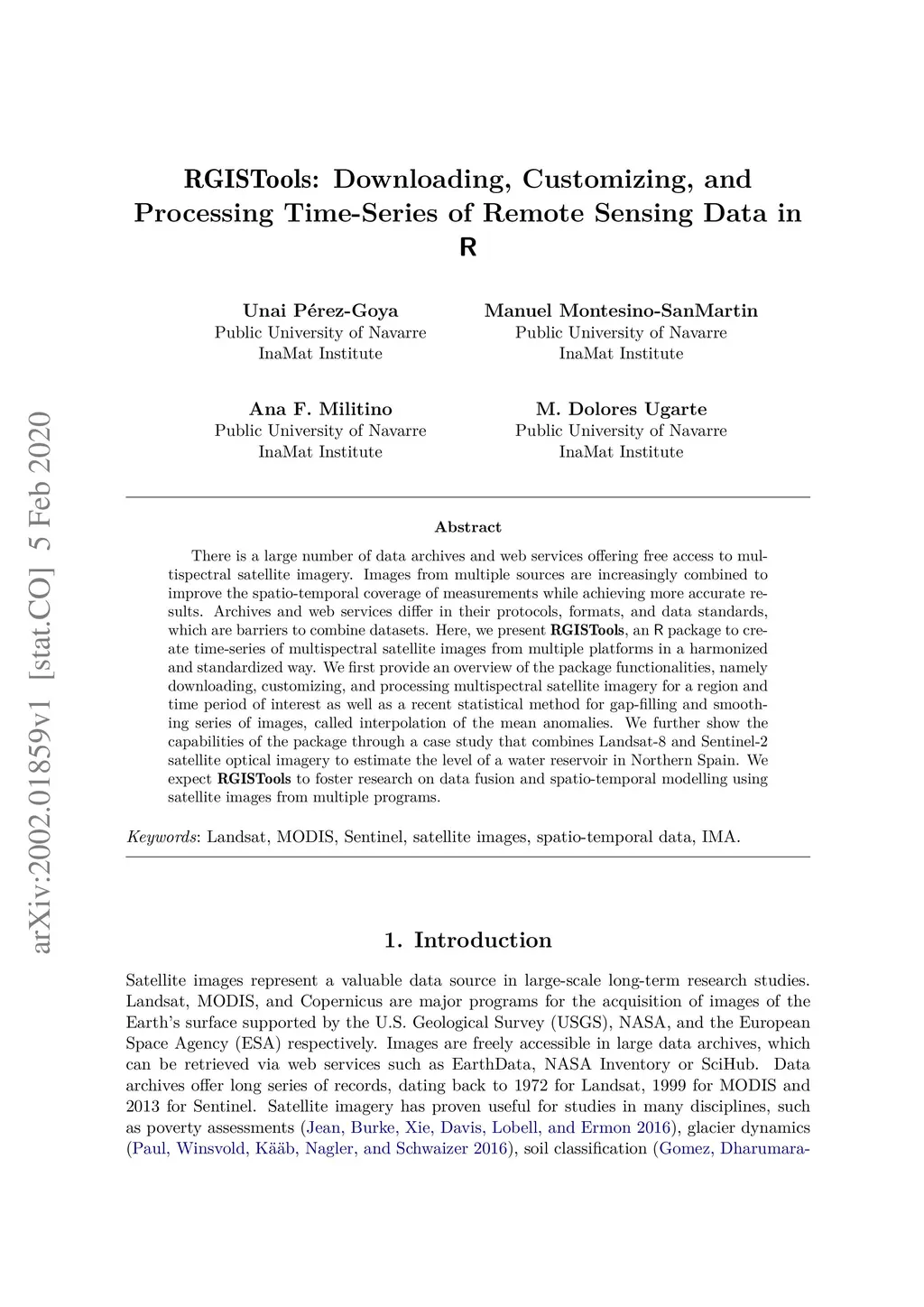 There is a large number of data archives and web services offering free access to multispectral satellite imagery. Images from multiple sources are increasingly combined to improve the spatio-temporal coverage of measurements while achieving more accurate results. Archives and web services differ in their protocols, formats, and data standards, which are barriers to combine datasets. Here, we present RGISTools, an R package to create time-series of multispectral satellite images from multiple platforms in a harmonized and standardized way. We first provide an overview of the package functionalities, namely downloading, customizing, and processing multispectral satellite imagery for a region and time period of interest as well as a recent statistical method for gap-filling and smoothing series of images, called interpolation of the mean anomalies. We further show the capabilities of the package through a case study that combines Landsat-8 and Sentinel-2 satellite optical imagery to estimate the level of a water reservoir in Northern Spain. We expect RGISTools to foster research on data fusion and spatio-temporal modelling using satellite images from multiple programs.