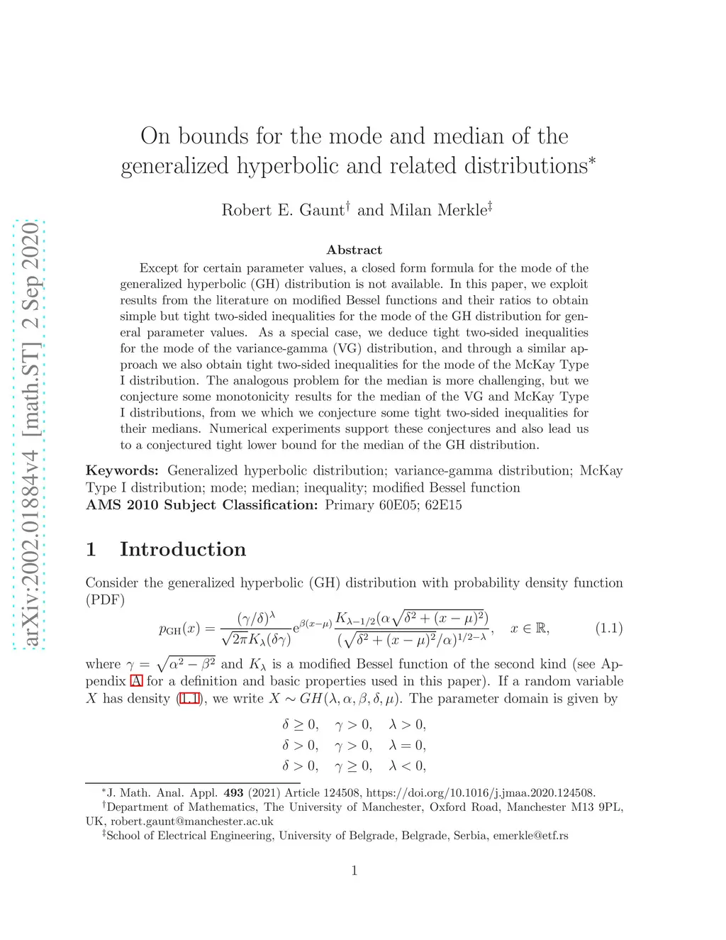 Except for certain parameter values, a closed form formula for the mode of the generalized hyperbolic (GH) distribution is not available. In this paper, we exploit results from the literature on modified Bessel functions and their ratios to obtain simple but tight two-sided inequalities for the mode of the GH distribution for general parameter values. As a special case, we deduce tight two-sided inequalities for the mode of the variance-gamma (VG) distribution, and through a similar approach we also obtain tight two-sided inequalities for the mode of the McKay Type I distribution. The analogous problem for the median is more challenging, but we conjecture some monotonicity results for the median of the VG and McKay Type I distributions, from we which we conjecture some tight two-sided inequalities for their medians. Numerical experiments support these conjectures and also lead us to a conjectured tight lower bound for the median of the GH distribution.