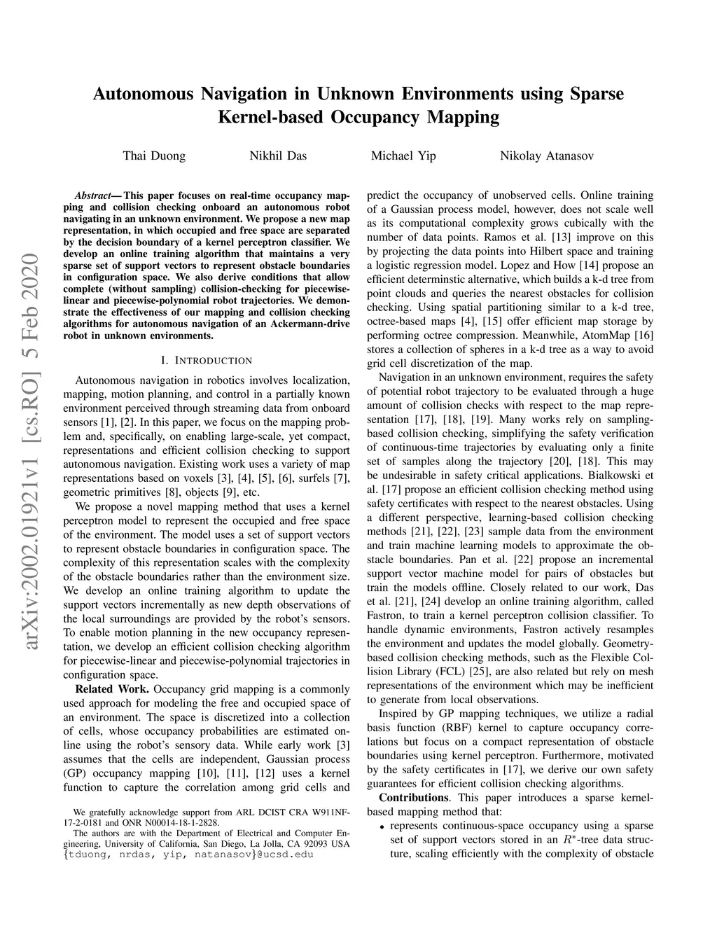 This paper focuses on real-time occupancy mapping and collision checking onboard an autonomous robot navigating in an unknown environment. We propose a new map representation, in which occupied and free space are separated by the decision boundary of a kernel perceptron classifier. We develop an online training algorithm that maintains a very sparse set of support vectors to represent obstacle boundaries in configuration space. We also derive conditions that allow complete (without sampling) collision-checking for piecewise-linear and piecewise-polynomial robot trajectories. We demonstrate the effectiveness of our mapping and collision checking algorithms for autonomous navigation of an Ackermann-drive robot in unknown environments.