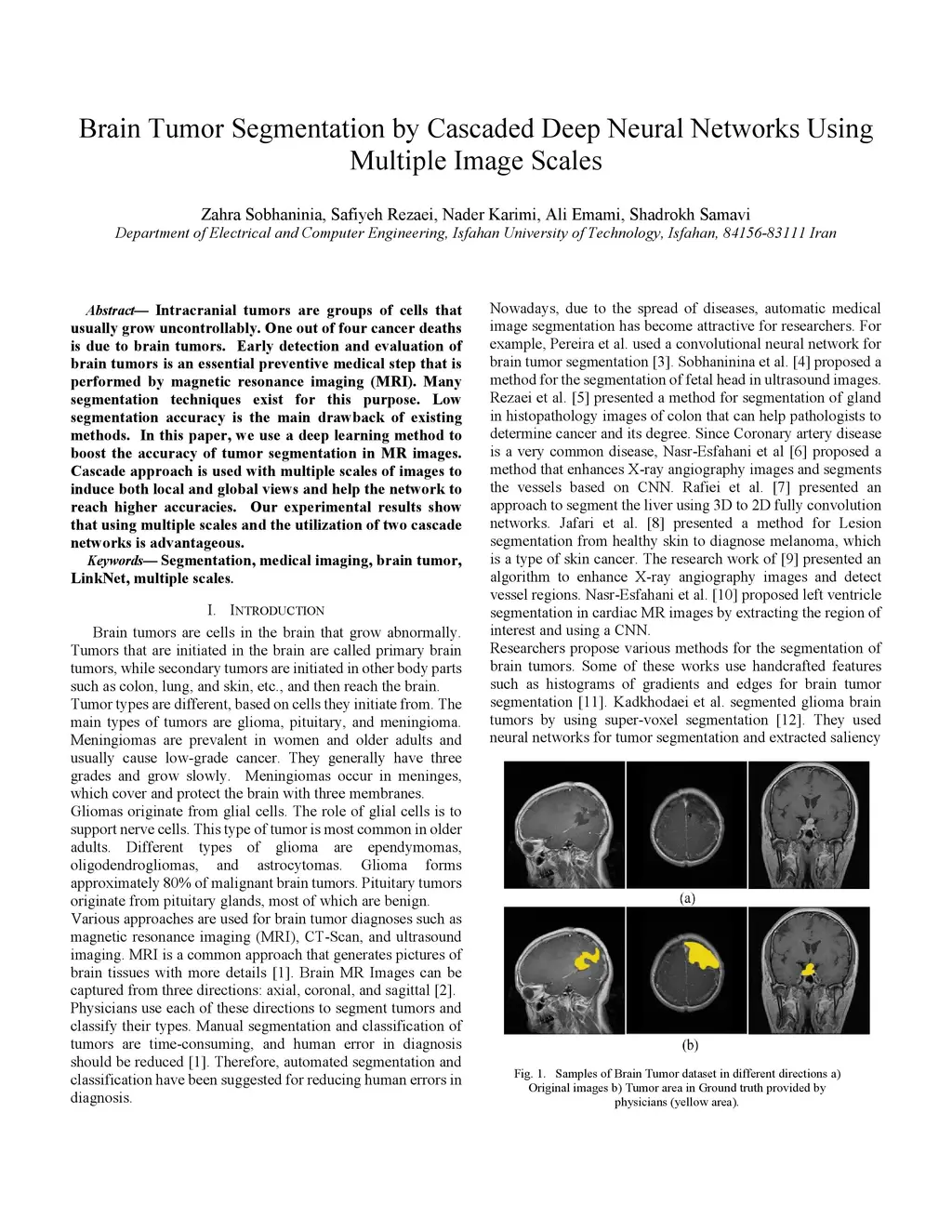Intracranial tumors are groups of cells that usually grow uncontrollably. One out of four cancer deaths is due to brain tumors. Early detection and evaluation of brain tumors is an essential preventive medical step that is performed by magnetic resonance imaging (MRI). Many segmentation techniques exist for this purpose. Low segmentation accuracy is the main drawback of existing methods. In this paper, we use a deep learning method to boost the accuracy of tumor segmentation in MR images. Cascade approach is used with multiple scales of images to induce both local and global views and help the network to reach higher accuracies. Our experimental results show that using multiple scales and the utilization of two cascade networks is advantageous.
