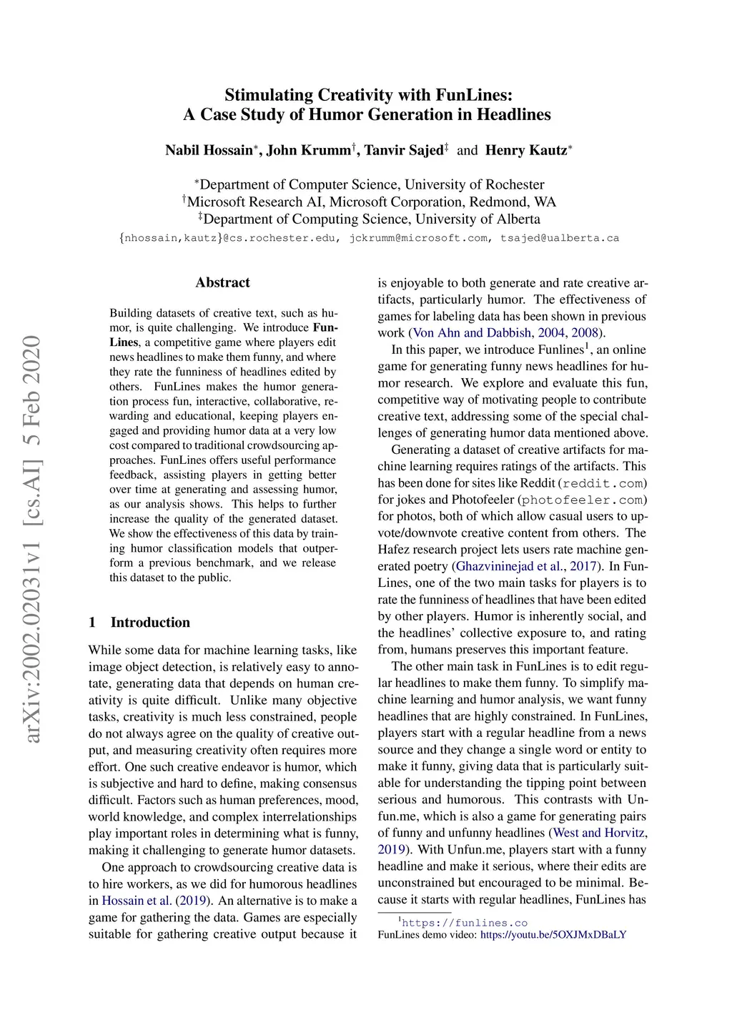 Building datasets of creative text, such as humor, is quite challenging. We introduce FunLines, a competitive game where players edit news headlines to make them funny, and where they rate the funniness of headlines edited by others. FunLines makes the humor generation process fun, interactive, collaborative, rewarding and educational, keeping players engaged and providing humor data at a very low cost compared to traditional crowdsourcing approaches. FunLines offers useful performance feedback, assisting players in getting better over time at generating and assessing humor, as our analysis shows. This helps to further increase the quality of the generated dataset. We show the effectiveness of this data by training humor classification models that outperform a previous benchmark, and we release this dataset to the public.