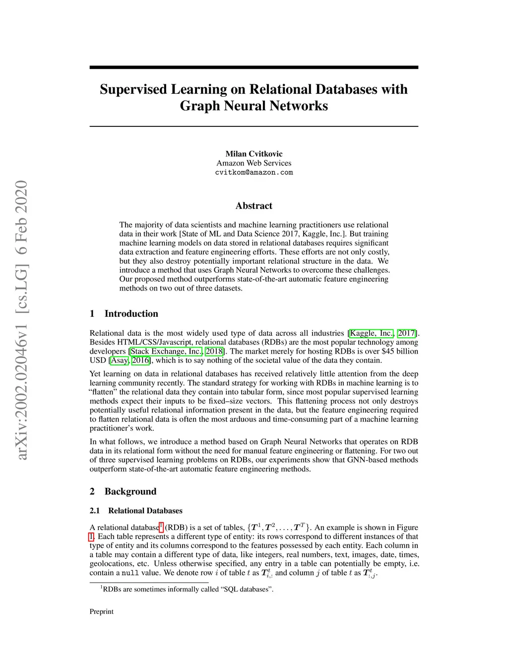 The majority of data scientists and machine learning practitioners use relational data in their work [State of ML and Data Science 2017, Kaggle, Inc.]. But training machine learning models on data stored in relational databases requires significant data extraction and feature engineering efforts. These efforts are not only costly, but they also destroy potentially important relational structure in the data. We introduce a method that uses Graph Neural Networks to overcome these challenges. Our proposed method outperforms state-of-the-art automatic feature engineering methods on two out of three datasets.