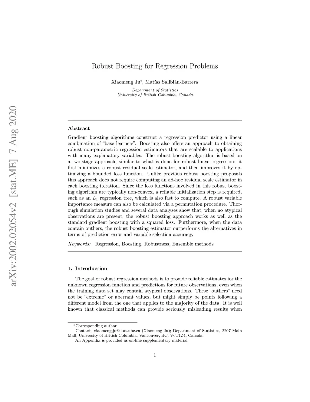Gradient boosting algorithms construct a regression predictor using a linear combination of ``base learners''. Boosting also offers an approach to obtaining robust non-parametric regression estimators that are scalable to applications with many explanatory variables. The robust boosting algorithm is based on a two-stage approach, similar to what is done for robust linear regression: it first minimizes a robust residual scale estimator, and then improves it by optimizing a bounded loss function. Unlike previous robust boosting proposals this approach does not require computing an ad-hoc residual scale estimator in each boosting iteration. Since the loss functions involved in this robust boosting algorithm are typically non-convex, a reliable initialization step is required, such as an L1 regression tree, which is also fast to compute. A robust variable importance measure can also be calculated via a permutation procedure. Thorough simulation studies and several data analyses show that, when no atypical observations are present, the robust boosting approach works as well as the standard gradient boosting with a squared loss. Furthermore, when the data contain outliers, the robust boosting estimator outperforms the alternatives in terms of prediction error and variable selection accuracy.