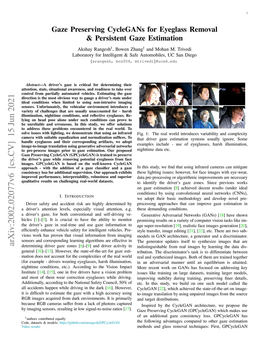 A driver's gaze is critical for determining their attention, state, situational awareness, and readiness to take over control from partially automated vehicles. Estimating the gaze direction is the most obvious way to gauge a driver's state under ideal conditions when limited to using non-intrusive imaging sensors. Unfortunately, the vehicular environment introduces a variety of challenges that are usually unaccounted for - harsh illumination, nighttime conditions, and reflective eyeglasses. Relying on head pose alone under such conditions can prove to be unreliable and erroneous. In this study, we offer solutions to address these problems encountered in the real world. To solve issues with lighting, we demonstrate that using an infrared camera with suitable equalization and normalization suffices. To handle eyeglasses and their corresponding artifacts, we adopt image-to-image translation using generative adversarial networks to pre-process images prior to gaze estimation. Our proposed Gaze Preserving CycleGAN (GPCycleGAN) is trained to preserve the driver's gaze while removing potential eyeglasses from face images. GPCycleGAN is based on the well-known CycleGAN approach - with the addition of a gaze classifier and a gaze consistency loss for additional supervision. Our approach exhibits improved performance, interpretability, robustness and superior qualitative results on challenging real-world datasets.