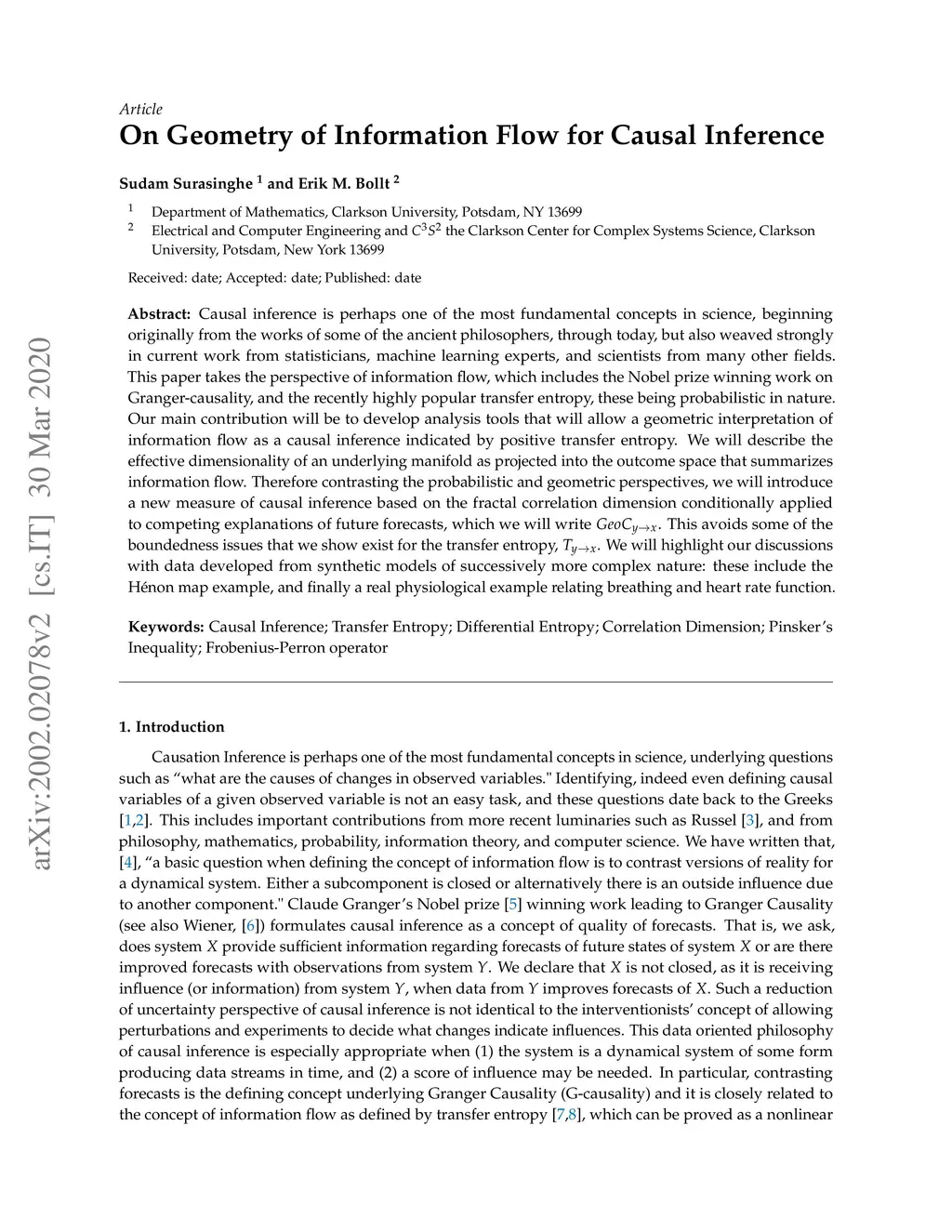 Causal inference is perhaps one of the most fundamental concepts in science, beginning originally from the works of some of the ancient philosophers, through today, but also weaved strongly in current work from statisticians, machine learning experts, and scientists from many other fields. This paper takes the perspective of information flow, which includes the Nobel prize winning work on Granger-causality, and the recently highly popular transfer entropy, these being probabilistic in nature. Our main contribution will be to develop analysis tools that will allow a geometric interpretation of information flow as a causal inference indicated by positive transfer entropy. We will describe the effective dimensionality of an underlying manifold as projected into the outcome space that summarizes information flow. Therefore contrasting the probabilistic and geometric perspectives, we will introduce a new measure of causal inference based on the fractal correlation dimension conditionally applied to competing explanations of future forecasts, which we will write . This avoids some of the boundedness issues that we show exist for the transfer entropy, . We will highlight our discussions with data developed from synthetic models of successively more complex nature: then include the H\'{e}non map example, and finally a real physiological example relating breathing and heart rate function. Keywords: Causal Inference; Transfer Entropy; Differential Entropy; Correlation Dimension; Pinsker's Inequality; Frobenius-Perron operator.