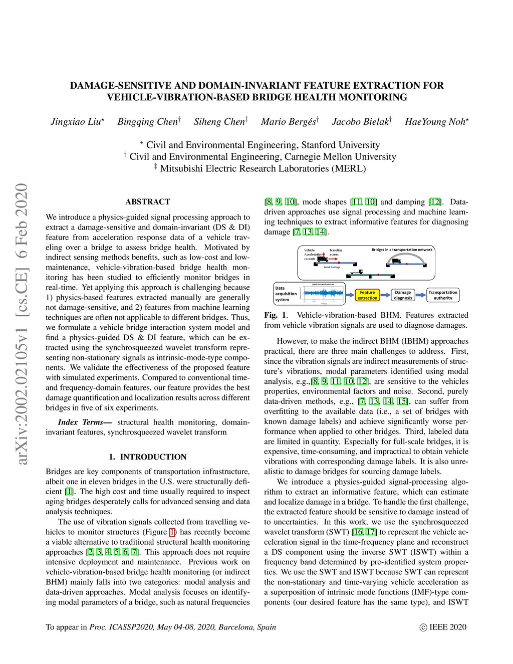 We introduce a physics-guided signal processing approach to extract a damage-sensitive and domain-invariant (DS & DI) feature from acceleration response data of a vehicle traveling over a bridge to assess bridge health. Motivated by indirect sensing methods' benefits, such as low-cost and low-maintenance, vehicle-vibration-based bridge health monitoring has been studied to efficiently monitor bridges in real-time. Yet applying this approach is challenging because 1) physics-based features extracted manually are generally not damage-sensitive, and 2) features from machine learning techniques are often not applicable to different bridges. Thus, we formulate a vehicle bridge interaction system model and find a physics-guided DS & DI feature, which can be extracted using the synchrosqueezed wavelet transform representing non-stationary signals as intrinsic-mode-type components. We validate the effectiveness of the proposed feature with simulated experiments. Compared to conventional time- and frequency-domain features, our feature provides the best damage quantification and localization results across different bridges in five of six experiments.