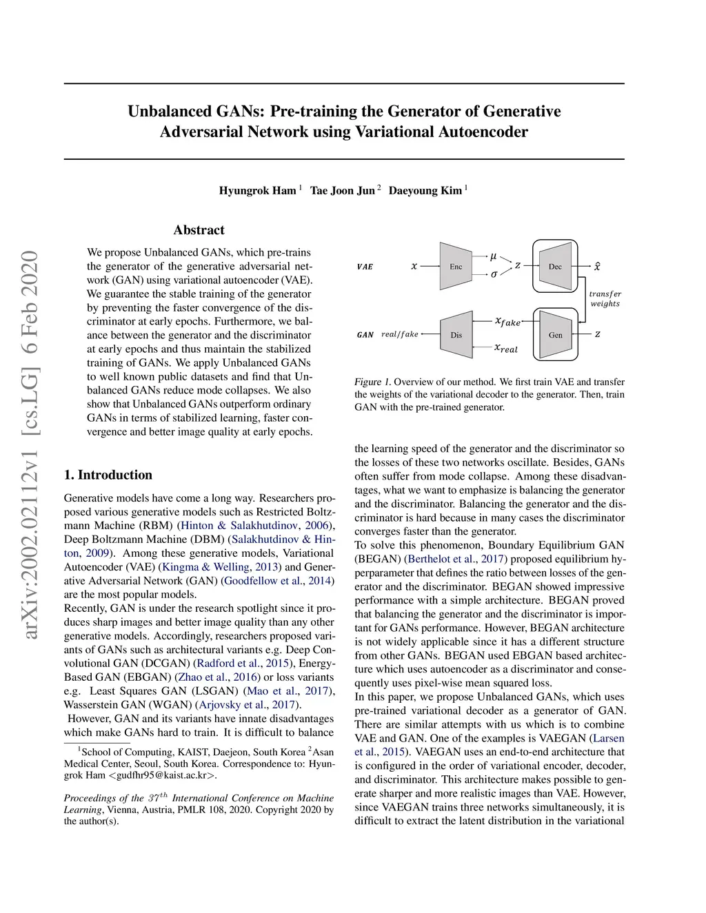 We propose Unbalanced GANs, which pre-trains the generator of the generative adversarial network (GAN) using variational autoencoder (VAE). We guarantee the stable training of the generator by preventing the faster convergence of the discriminator at early epochs. Furthermore, we balance between the generator and the discriminator at early epochs and thus maintain the stabilized training of GANs. We apply Unbalanced GANs to well known public datasets and find that Unbalanced GANs reduce mode collapses. We also show that Unbalanced GANs outperform ordinary GANs in terms of stabilized learning, faster convergence and better image quality at early epochs.