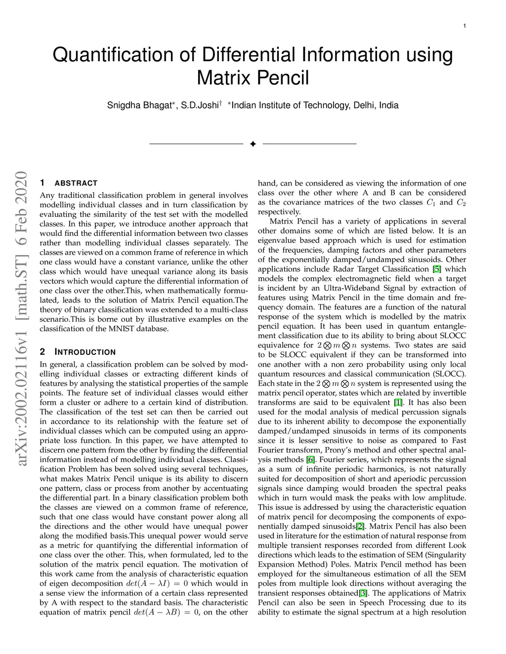 Any traditional classification problem in general involves modelling individual classes and in turn classification by evaluating the similarity of the test set with the modelled classes. In this paper, we introduce another approach that would find the differential information between two classes rather than modelling individual classes separately. The classes are viewed on a common frame of reference in which one class would have a constant variance, unlike the other class which would have unequal variance along its basis vectors which would capture the differential information of one class over the other.This, when mathematically formulated, leads to the solution of Matrix Pencil equation.The theory of binary classification was extended to a multi-class scenario.This is borne out by illustrative examples on the classification of the MNIST database.