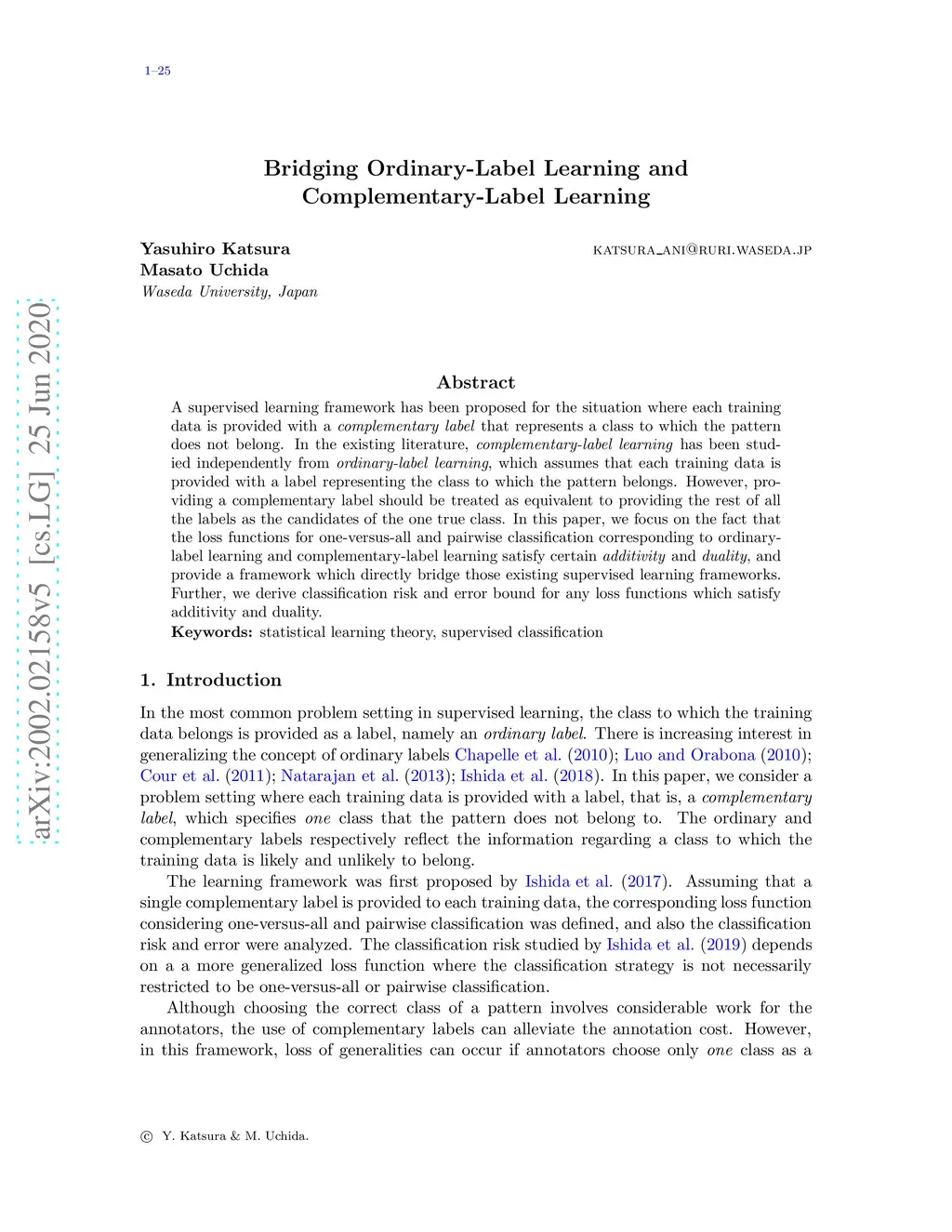 A supervised learning framework has been proposed for the situation where each training data is provided with a complementary label that represents a class to which the pattern does not belong. In the existing literature, complementary-label learning has been studied independently from ordinary-label learning, which assumes that each training data is provided with a label representing the class to which the pattern belongs. However, providing a complementary label should be treated as equivalent to providing the rest of all the labels as the candidates of the one true class. In this paper, we focus on the fact that the loss functions for one-versus-all and pairwise classification corresponding to ordinary-label learning and complementary-label learning satisfy certain additivity and duality, and provide a framework which directly bridge those existing supervised learning frameworks. Further, we derive classification risk and error bound for any loss functions which satisfy additivity and duality.