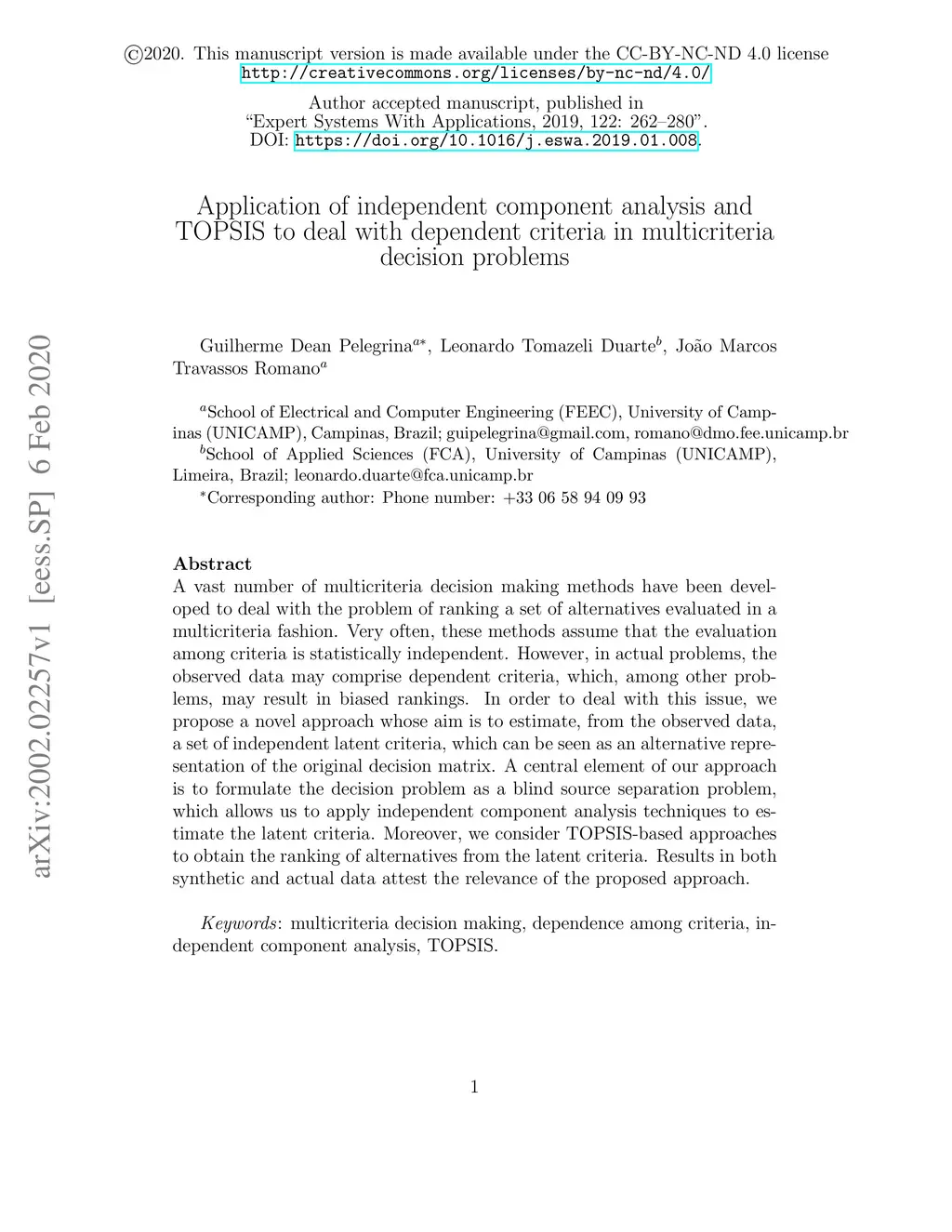 A vast number of multicriteria decision making methods have been developed to deal with the problem of ranking a set of alternatives evaluated in a multicriteria fashion. Very often, these methods assume that the evaluation among criteria is statistically independent. However, in actual problems, the observed data may comprise dependent criteria, which, among other problems, may result in biased rankings. In order to deal with this issue, we propose a novel approach whose aim is to estimate, from the observed data, a set of independent latent criteria, which can be seen as an alternative representation of the original decision matrix. A central element of our approach is to formulate the decision problem as a blind source separation problem, which allows us to apply independent component analysis techniques to estimate the latent criteria. Moreover, we consider TOPSIS-based approaches to obtain the ranking of alternatives from the latent criteria. Results in both synthetic and actual data attest the relevance of the proposed approach.