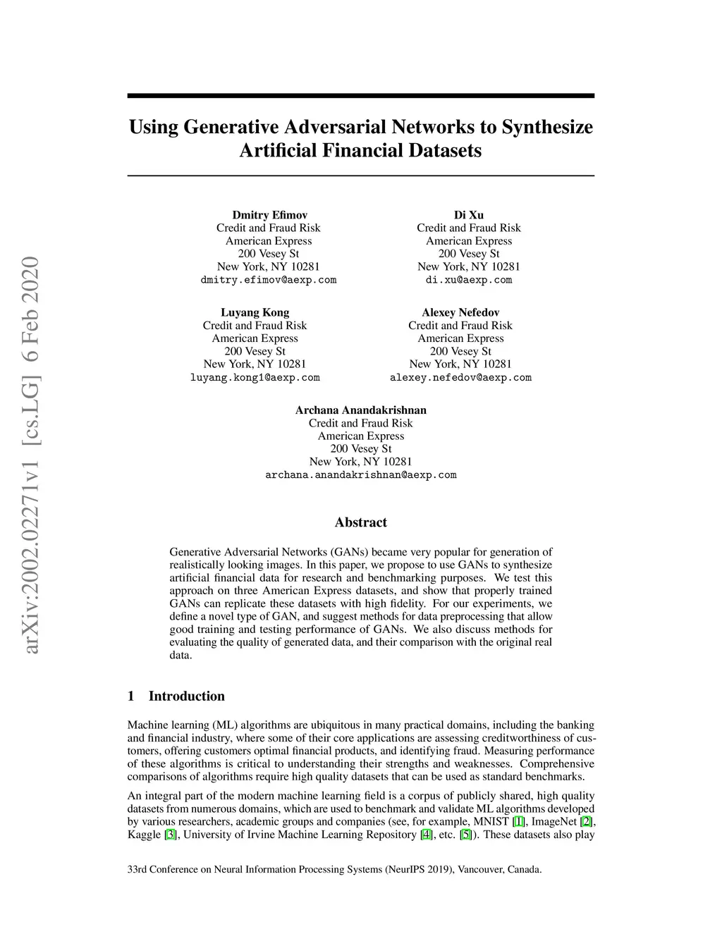 Generative Adversarial Networks (GANs) became very popular for generation of realistically looking images. In this paper, we propose to use GANs to synthesize artificial financial data for research and benchmarking purposes. We test this approach on three American Express datasets, and show that properly trained GANs can replicate these datasets with high fidelity. For our experiments, we define a novel type of GAN, and suggest methods for data preprocessing that allow good training and testing performance of GANs. We also discuss methods for evaluating the quality of generated data, and their comparison with the original real data.