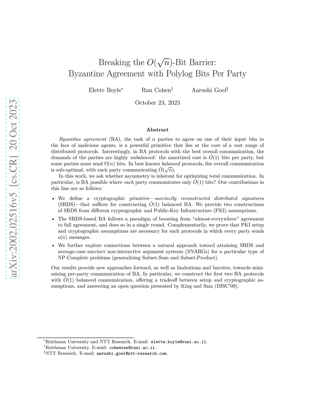 Byzantine agreement (BA), the task of parties to agree on one of their input bits in the face of malicious agents, is a powerful primitive that lies at the core of a vast range of distributed protocols. Interestingly, in protocols with the best overall communication, the demands of the parties are highly unbalanced: the amortized cost is bits per party, but some parties must send bits. In best known balanced protocols, the overall communication is sub-optimal, with each party communicating . In this work, we ask whether asymmetry is inherent for optimizing total communication. Our contributions in this line are as follows: 1) We define a cryptographic primitive, succinctly reconstructed distributed signatures (SRDS), that suffices for constructing balanced BA. We provide two constructions of SRDS from different cryptographic and Public-Key Infrastructure (PKI) assumptions. 2) The SRDS-based BA follows a paradigm of boosting from "almost-everywhere" agreement to full agreement, and does so in a single round. We prove that PKI setup and cryptographic assumptions are necessary for such protocols in which every party sends messages. 3) We further explore connections between a natural approach toward attaining SRDS and average-case succinct non-interactive argument systems (SNARGs) for a particular type of NP-Complete problems (generalizing Subset-Sum and Subset-Product). Our results provide new approaches forward, as well as limitations and barriers, towards minimizing per-party communication of BA. In particular, we construct the first two BA protocols with balanced communication, offering a tradeoff between setup and cryptographic assumptions, and answering an open question presented by King and Saia (DISC'09).