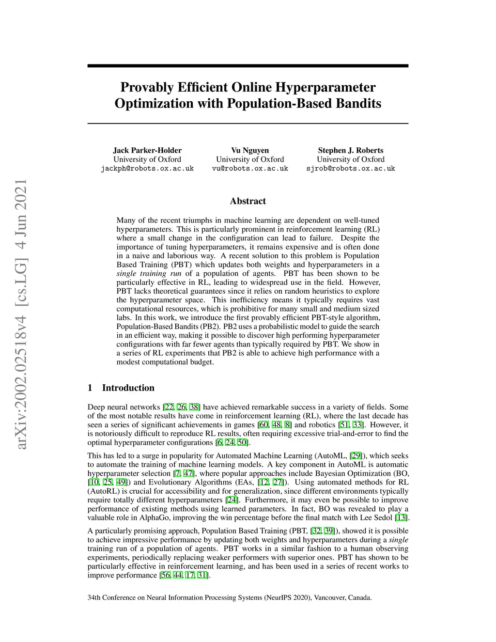 Many of the recent triumphs in machine learning are dependent on well-tuned hyperparameters. This is particularly prominent in reinforcement learning (RL) where a small change in the configuration can lead to failure. Despite the importance of tuning hyperparameters, it remains expensive and is often done in a naive and laborious way. A recent solution to this problem is Population Based Training (PBT) which updates both weights and hyperparameters in a single training run of a population of agents. PBT has been shown to be particularly effective in RL, leading to widespread use in the field. However, PBT lacks theoretical guarantees since it relies on random heuristics to explore the hyperparameter space. This inefficiency means it typically requires vast computational resources, which is prohibitive for many small and medium sized labs. In this work, we introduce the first provably efficient PBT-style algorithm, Population-Based Bandits (PB2). PB2 uses a probabilistic model to guide the search in an efficient way, making it possible to discover high performing hyperparameter configurations with far fewer agents than typically required by PBT. We show in a series of RL experiments that PB2 is able to achieve high performance with a modest computational budget.