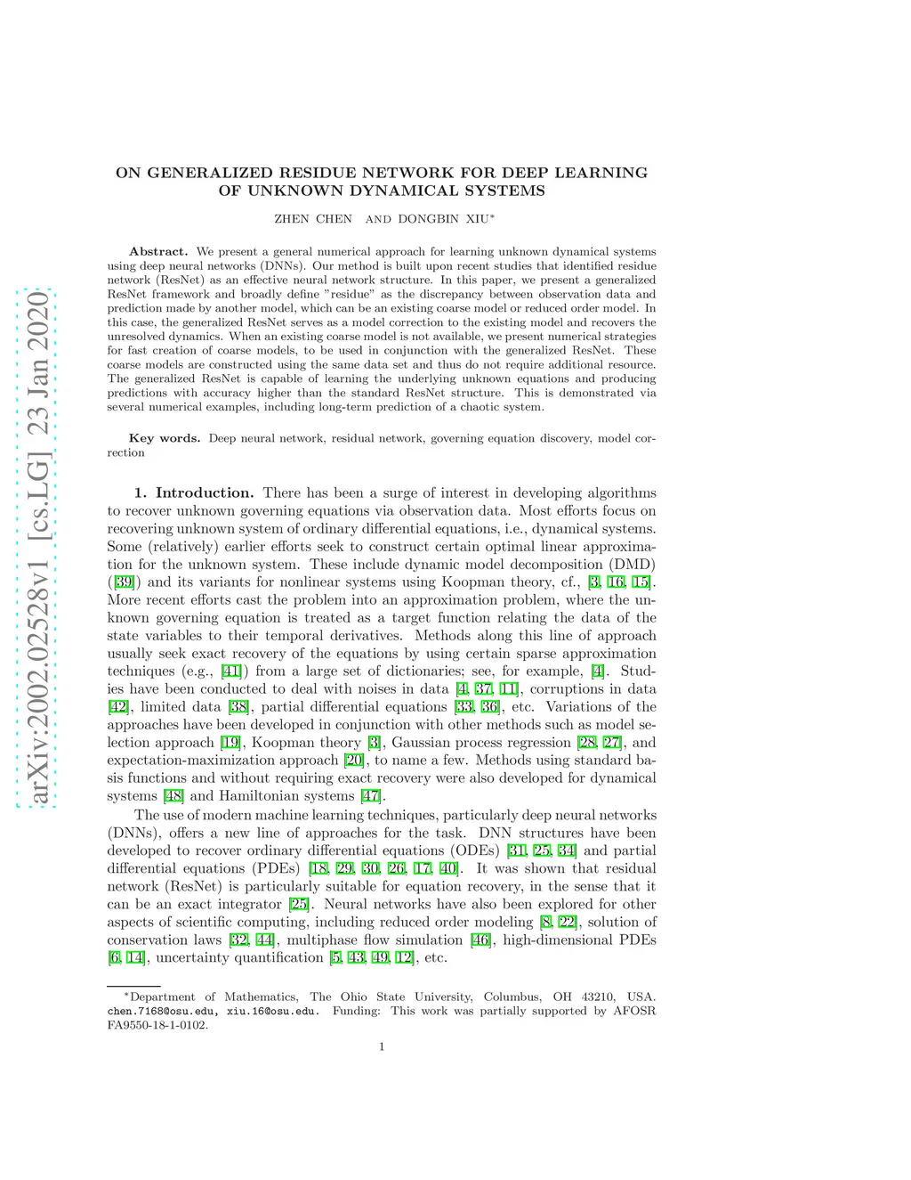 We present a general numerical approach for learning unknown dynamical systems using deep neural networks (DNNs). Our method is built upon recent studies that identified the residue network (ResNet) as an effective neural network structure. In this paper, we present a generalized ResNet framework and broadly define residue as the discrepancy between observation data and prediction made by another model, which can be an existing coarse model or reduced-order model. In this case, the generalized ResNet serves as a model correction to the existing model and recovers the unresolved dynamics. When an existing coarse model is not available, we present numerical strategies for fast creation of coarse models, to be used in conjunction with the generalized ResNet. These coarse models are constructed using the same data set and thus do not require additional resources. The generalized ResNet is capable of learning the underlying unknown equations and producing predictions with accuracy higher than the standard ResNet structure. This is demonstrated via several numerical examples, including long-term prediction of a chaotic system.