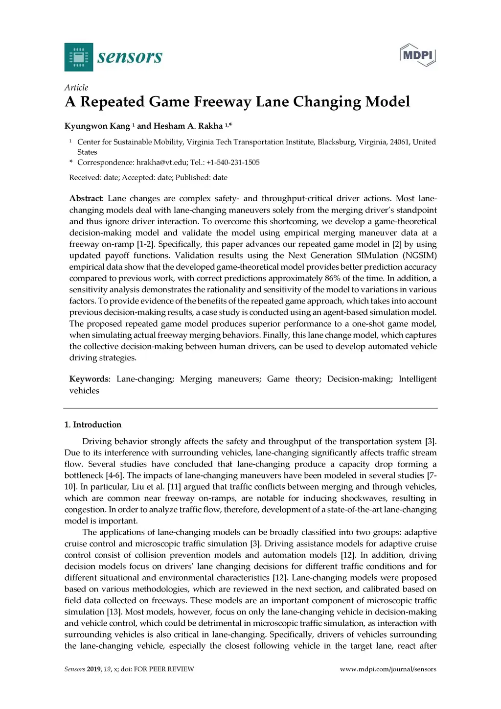Lane changes are complex safety and throughput critical driver actions. Most lane changing models deal with lane-changing maneuvers solely from the merging driver's standpoint and thus ignore driver interaction. To overcome this shortcoming, we develop a game-theoretical decision-making model and validate the model using empirical merging maneuver data at a freeway on-ramp. Specifically, this paper advances our repeated game model in a previous paper by using updated payoff functions. Validation results using the NGSIM empirical data show that the developed game-theoretical model provides better prediction accuracy compared to previous work, with correct predictions approximately 86 percent of the time. In addition, a sensitivity analysis demonstrates the rationality and sensitivity of the model to variations in various factors. To provide evidence of the benefits of the repeated game approach, which takes into account previous decision-making results, a case study is conducted using an agent-based simulation model. The proposed repeated game model produces superior performance to a one-shot game model, when simulating actual freeway merging behaviors. Finally, this lane change model, which captures the collective decision-making between human drivers, can be used to develop automated vehicle driving strategies.