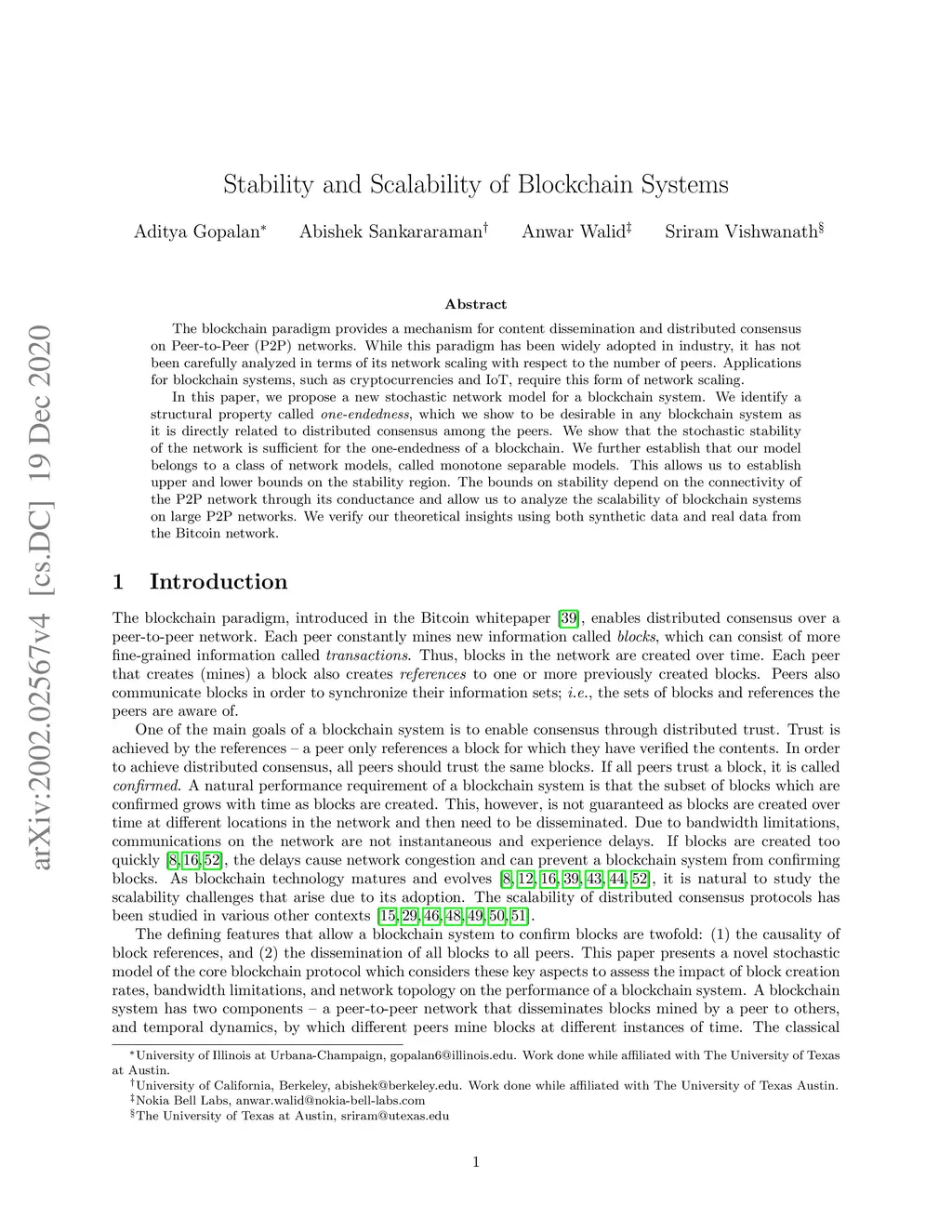 The blockchain paradigm provides a mechanism for content dissemination and distributed consensus on Peer-to-Peer (P2P) networks. While this paradigm has been widely adopted in industry, it has not been carefully analyzed in terms of its network scaling with respect to the number of peers. Applications for blockchain systems, such as cryptocurrencies and IoT, require this form of network scaling. In this paper, we propose a new stochastic network model for a blockchain system. We identify a structural property called \emph{one-endedness}, which we show to be desirable in any blockchain system as it is directly related to distributed consensus among the peers. We show that the stochastic stability of the network is sufficient for the one-endedness of a blockchain. We further establish that our model belongs to a class of network models, called monotone separable models. This allows us to establish upper and lower bounds on the stability region. The bounds on stability depend on the connectivity of the P2P network through its conductance and allow us to analyze the scalability of blockchain systems on large P2P networks. We verify our theoretical insights using both synthetic data and real data from the Bitcoin network.
