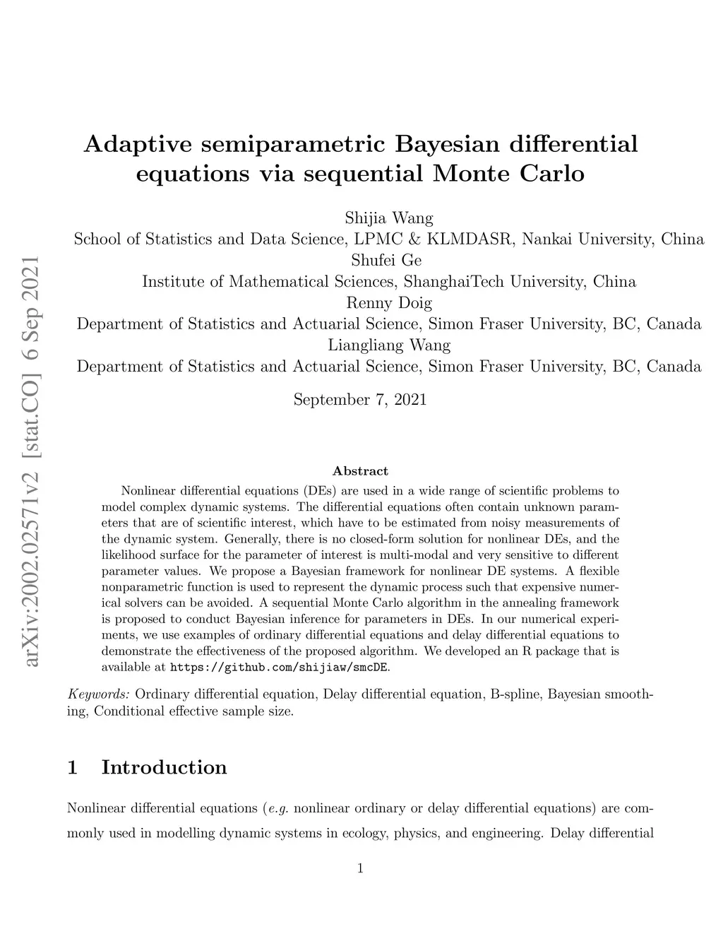 Nonlinear differential equations (DEs) are used in a wide range of scientific problems to model complex dynamic systems. The differential equations often contain unknown parameters that are of scientific interest, which have to be estimated from noisy measurements of the dynamic system. Generally, there is no closed-form solution for nonlinear DEs, and the likelihood surface for the parameter of interest is multi-modal and very sensitive to different parameter values. We propose a fully Bayesian framework for nonlinear DEs system. A flexible nonparametric function is used to represent the dynamic process such that expensive numerical solvers can be avoided. A sequential Monte Carlo in the annealing framework is proposed to conduct Bayesian inference for parameters in DEs. In our numerical experiments, we use examples of ordinary differential equations and delay differential equations to demonstrate the effectiveness of the proposed algorithm. We developed an R package that is available at \url{https://github.com/shijiaw/smcDE}.