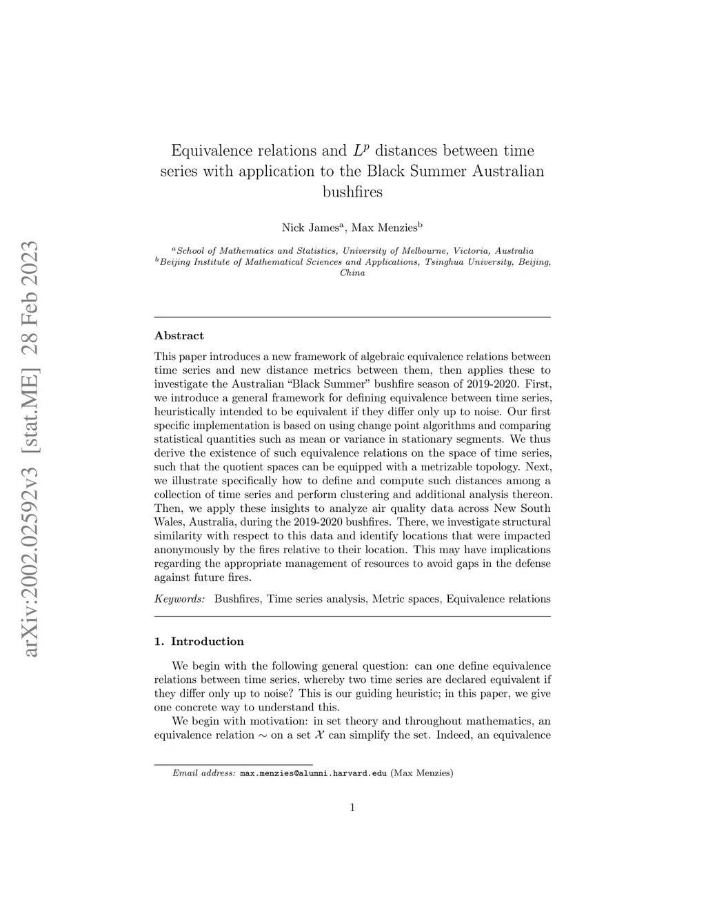 We introduce a general framework for defining equivalence and measuring distances between time series, and a first concrete method for doing so. We prove the existence of equivalence relations on the space of time series, such that the quotient spaces can be equipped with a metrizable topology. We illustrate algorithmically how to calculate such distances among a collection of time series, and perform clustering analysis based on these distances. We apply these insights to analyse the recent bushfires in NSW, Australia. There, we introduce a new method to analyse time series in a cross-contextual setting.