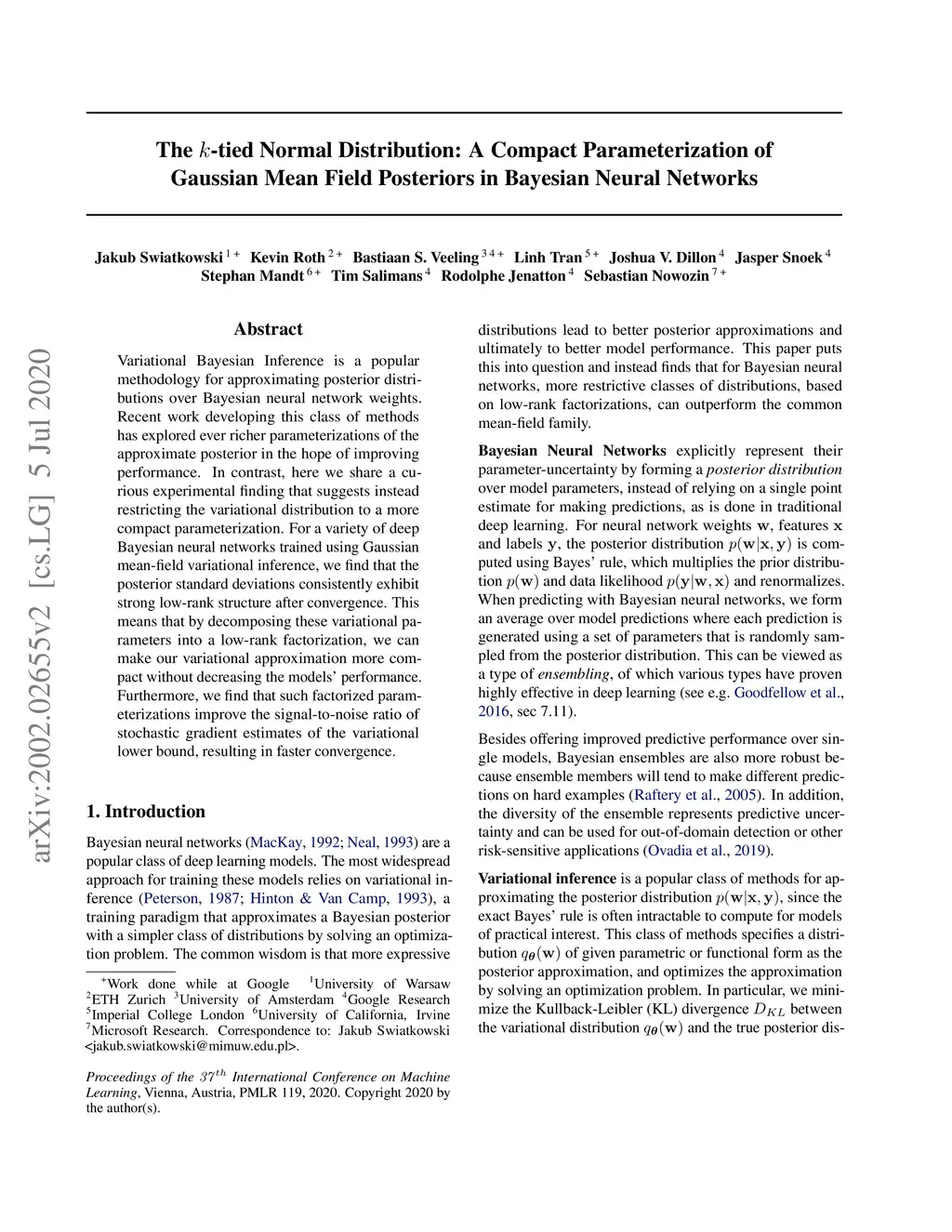 Variational Bayesian Inference is a popular methodology for approximating posterior distributions over Bayesian neural network weights. Recent work developing this class of methods has explored ever richer parameterizations of the approximate posterior in the hope of improving performance. In contrast, here we share a curious experimental finding that suggests instead restricting the variational distribution to a more compact parameterization. For a variety of deep Bayesian neural networks trained using Gaussian mean-field variational inference, we find that the posterior standard deviations consistently exhibit strong low-rank structure after convergence. This means that by decomposing these variational parameters into a low-rank factorization, we can make our variational approximation more compact without decreasing the models' performance. Furthermore, we find that such factorized parameterizations improve the signal-to-noise ratio of stochastic gradient estimates of the variational lower bound, resulting in faster convergence.