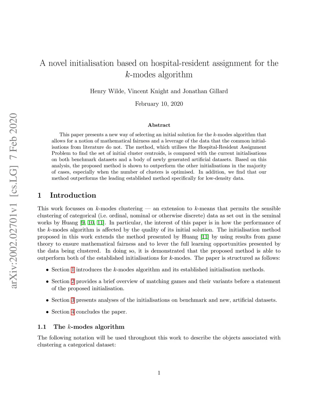 This paper presents a new way of selecting an initial solution for the k-modes algorithm that allows for a notion of mathematical fairness and a leverage of the data that the common initialisations from literature do not. The method, which utilises the Hospital-Resident Assignment Problem to find the set of initial cluster centroids, is compared with the current initialisations on both benchmark datasets and a body of newly generated artificial datasets. Based on this analysis, the proposed method is shown to outperform the other initialisations in the majority of cases, especially when the number of clusters is optimised. In addition, we find that our method outperforms the leading established method specifically for low-density data.