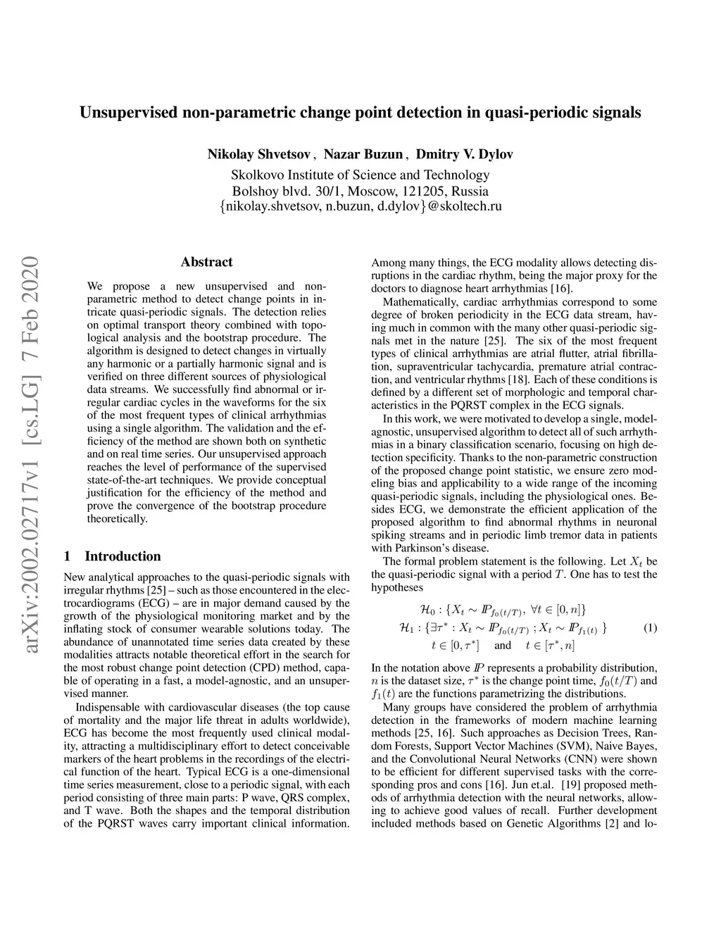 We propose a new unsupervised and non-parametric method to detect change points in intricate quasi-periodic signals. The detection relies on optimal transport theory combined with topological analysis and the bootstrap procedure. The algorithm is designed to detect changes in virtually any harmonic or a partially harmonic signal and is verified on three different sources of physiological data streams. We successfully find abnormal or irregular cardiac cycles in the waveforms for the six of the most frequent types of clinical arrhythmias using a single algorithm. The validation and the efficiency of the method are shown both on synthetic and on real time series. Our unsupervised approach reaches the level of performance of the supervised state-of-the-art techniques. We provide conceptual justification for the efficiency of the method and prove the convergence of the bootstrap procedure theoretically.