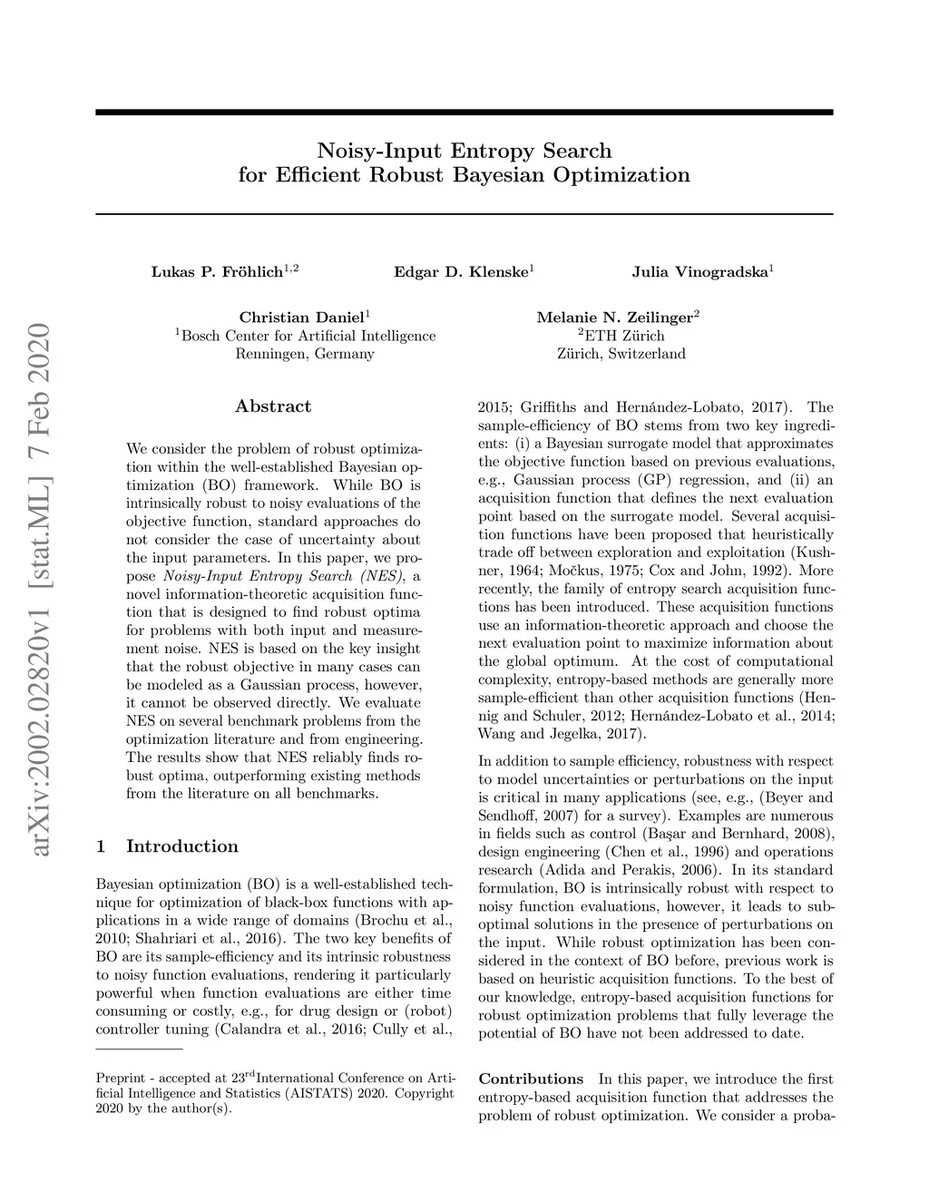 We consider the problem of robust optimization within the well-established Bayesian optimization (BO) framework. While BO is intrinsically robust to noisy evaluations of the objective function, standard approaches do not consider the case of uncertainty about the input parameters. In this paper, we propose Noisy-Input Entropy Search (NES), a novel information-theoretic acquisition function that is designed to find robust optima for problems with both input and measurement noise. NES is based on the key insight that the robust objective in many cases can be modeled as a Gaussian process, however, it cannot be observed directly. We evaluate NES on several benchmark problems from the optimization literature and from engineering. The results show that NES reliably finds robust optima, outperforming existing methods from the literature on all benchmarks.