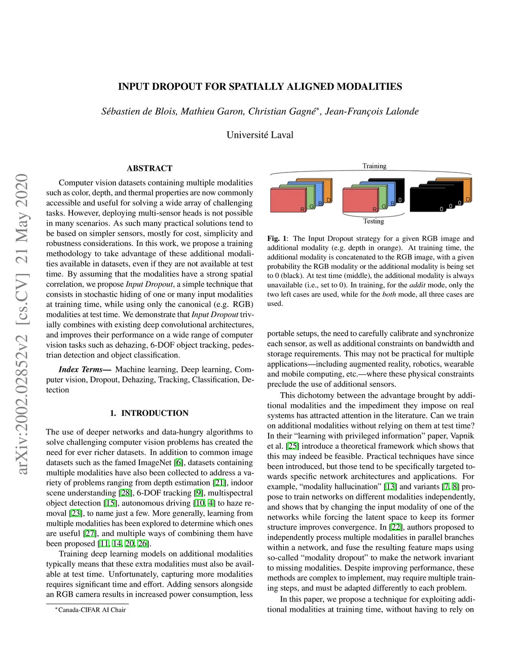 Computer vision datasets containing multiple modalities such as color, depth, and thermal properties are now commonly accessible and useful for solving a wide array of challenging tasks. However, deploying multi-sensor heads is not possible in many scenarios. As such many practical solutions tend to be based on simpler sensors, mostly for cost, simplicity and robustness considerations. In this work, we propose a training methodology to take advantage of these additional modalities available in datasets, even if they are not available at test time. By assuming that the modalities have a strong spatial correlation, we propose Input Dropout, a simple technique that consists in stochastic hiding of one or many input modalities at training time, while using only the canonical (e.g. RGB) modalities at test time. We demonstrate that Input Dropout trivially combines with existing deep convolutional architectures, and improves their performance on a wide range of computer vision tasks such as dehazing, 6-DOF object tracking, pedestrian detection and object classification.