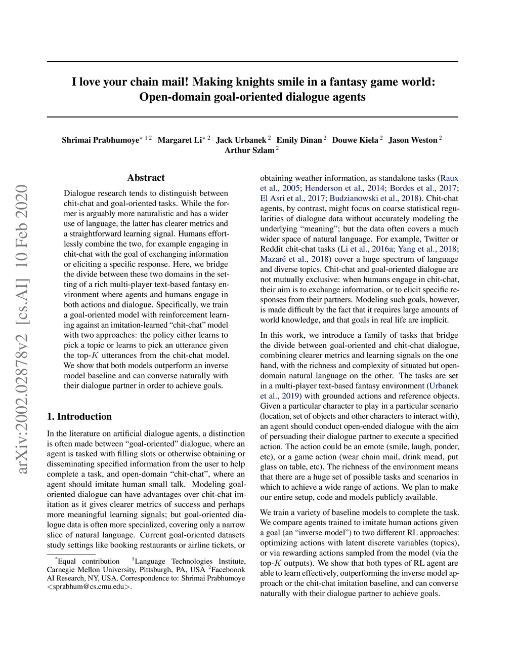Dialogue research tends to distinguish between chit-chat and goal-oriented tasks. While the former is arguably more naturalistic and has a wider use of language, the latter has clearer metrics and a straightforward learning signal. Humans effortlessly combine the two, for example engaging in chit-chat with the goal of exchanging information or eliciting a specific response. Here, we bridge the divide between these two domains in the setting of a rich multi-player text-based fantasy environment where agents and humans engage in both actions and dialogue. Specifically, we train a goal-oriented model with reinforcement learning against an imitation-learned ``chit-chat'' model with two approaches: the policy either learns to pick a topic or learns to pick an utterance given the top-K utterances from the chit-chat model. We show that both models outperform an inverse model baseline and can converse naturally with their dialogue partner in order to achieve goals.