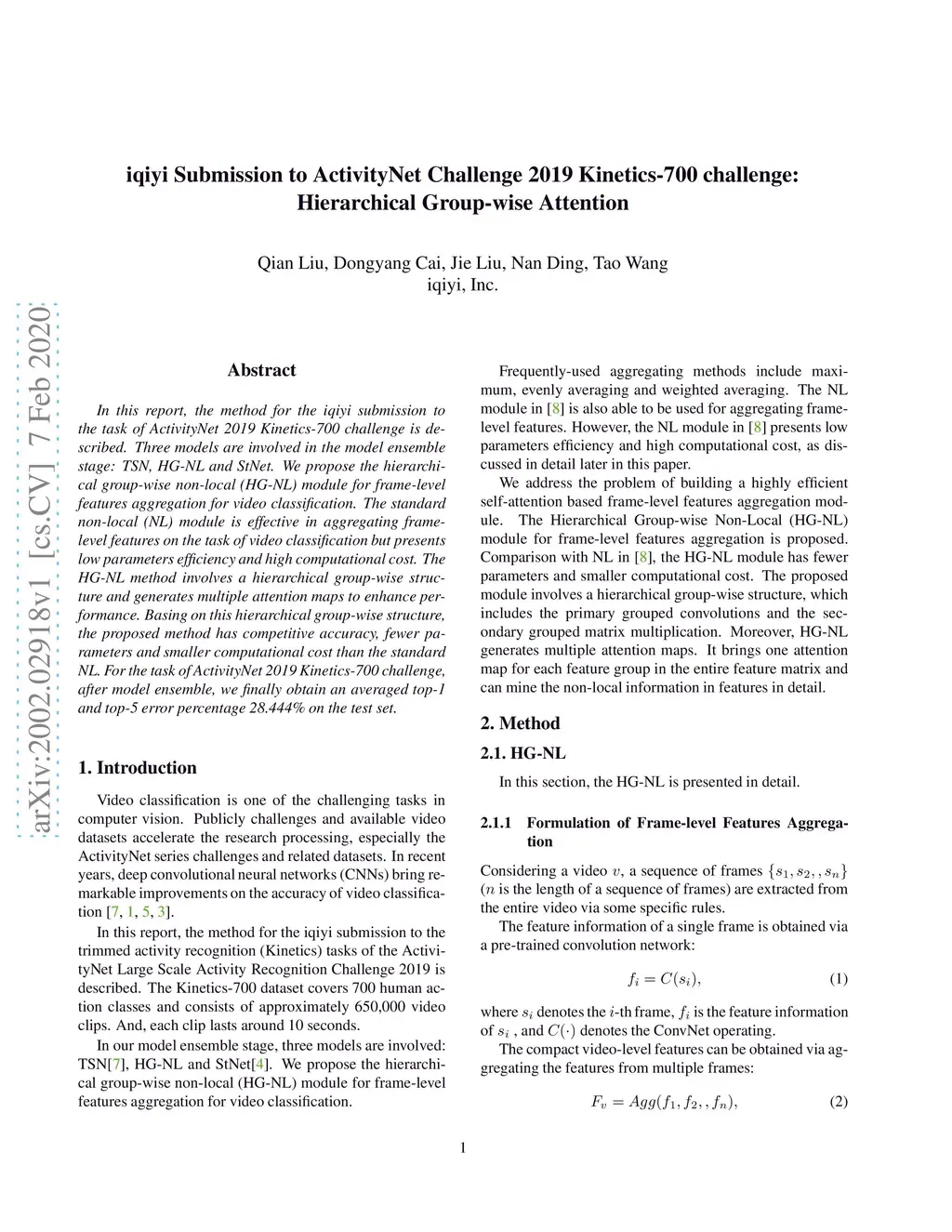 In this report, the method for the iqiyi submission to the task of ActivityNet 2019 Kinetics-700 challenge is described. Three models are involved in the model ensemble stage: TSN, HG-NL and StNet. We propose the hierarchical group-wise non-local (HG-NL) module for frame-level features aggregation for video classification. The standard non-local (NL) module is effective in aggregating frame-level features on the task of video classification but presents low parameters efficiency and high computational cost. The HG-NL method involves a hierarchical group-wise structure and generates multiple attention maps to enhance performance. Basing on this hierarchical group-wise structure, the proposed method has competitive accuracy, fewer parameters and smaller computational cost than the standard NL. For the task of ActivityNet 2019 Kinetics-700 challenge, after model ensemble, we finally obtain an averaged top-1 and top-5 error percentage 28.444% on the test set.