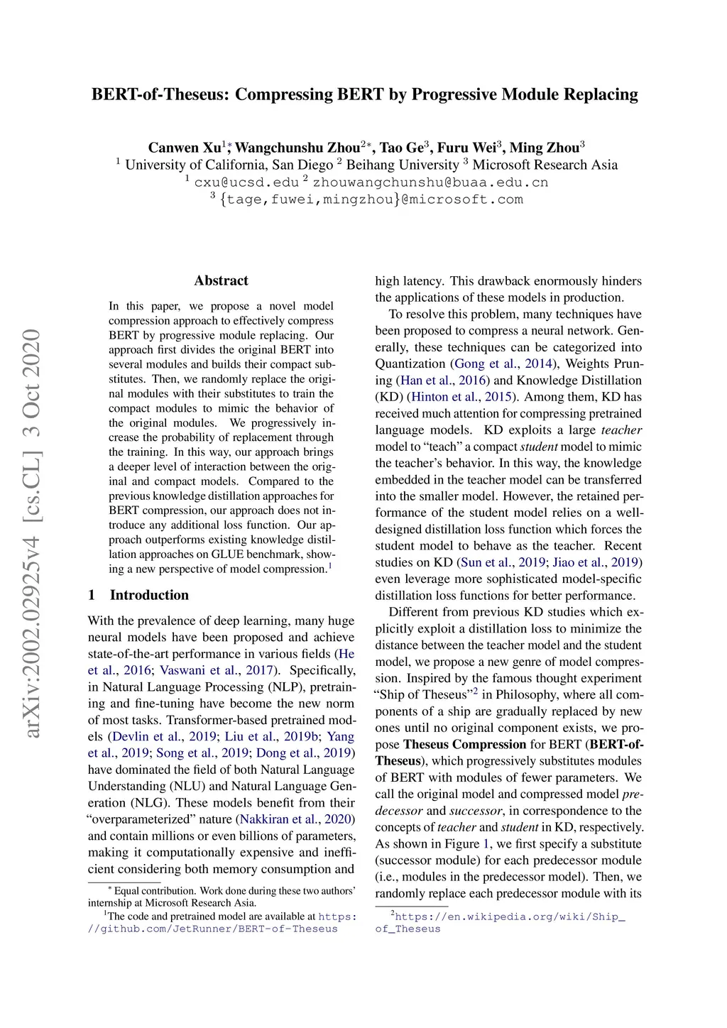 BERT-of-Theseus: Compressing BERT by Progressive Module Replacing