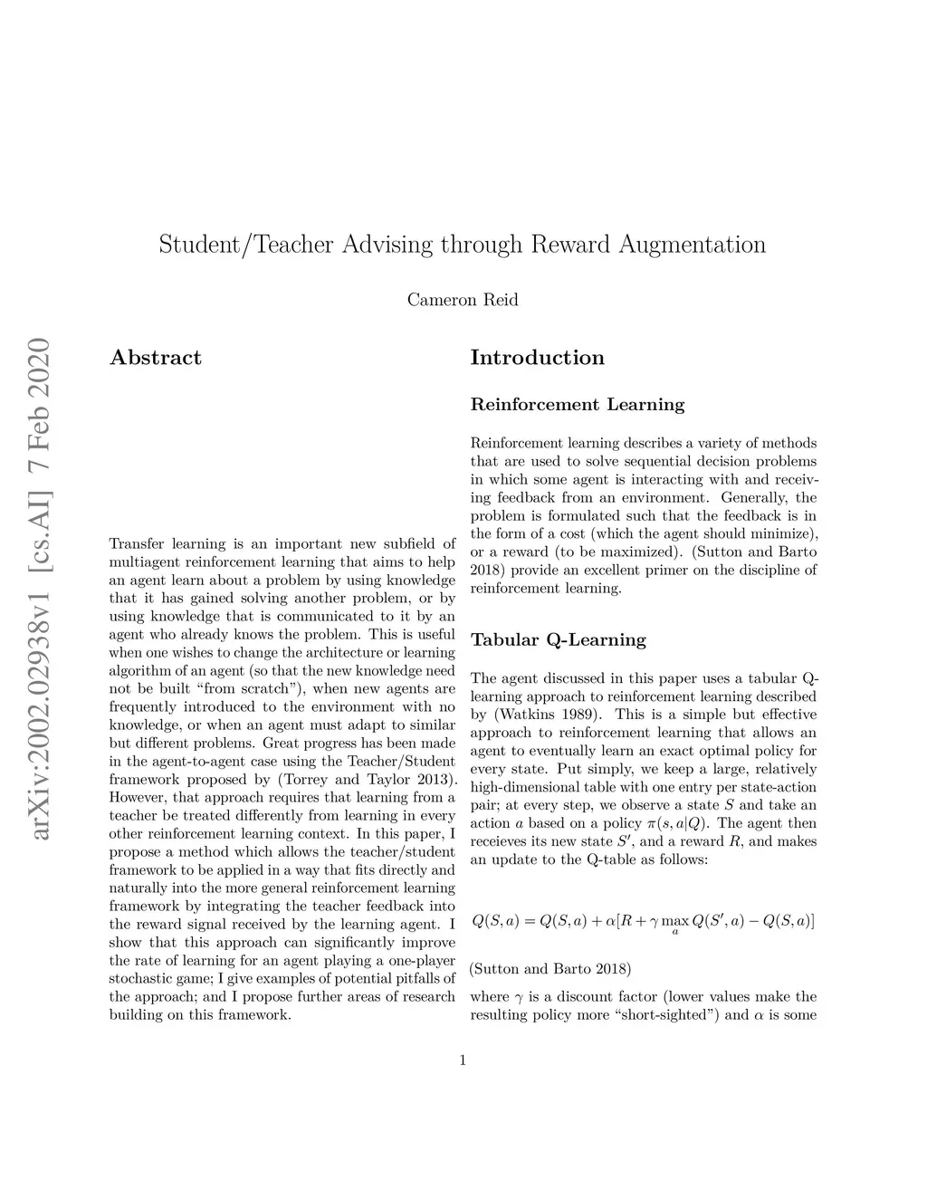 Transfer learning is an important new subfield of multiagent reinforcement learning that aims to help an agent learn about a problem by using knowledge that it has gained solving another problem, or by using knowledge that is communicated to it by an agent who already knows the problem. This is useful when one wishes to change the architecture or learning algorithm of an agent (so that the new knowledge need not be built "from scratch"), when new agents are frequently introduced to the environment with no knowledge, or when an agent must adapt to similar but different problems. Great progress has been made in the agent-to-agent case using the Teacher/Student framework proposed by (Torrey and Taylor 2013). However, that approach requires that learning from a teacher be treated differently from learning in every other reinforcement learning context. In this paper, I propose a method which allows the teacher/student framework to be applied in a way that fits directly and naturally into the more general reinforcement learning framework by integrating the teacher feedback into the reward signal received by the learning agent. I show that this approach can significantly improve the rate of learning for an agent playing a one-player stochastic game; I give examples of potential pitfalls of the approach; and I propose further areas of research building on this framework.