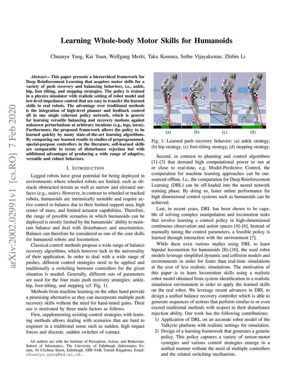 This paper presents a hierarchical framework for Deep Reinforcement Learning that acquires motor skills for a variety of push recovery and balancing behaviors, i.e., ankle, hip, foot tilting, and stepping strategies. The policy is trained in a physics simulator with realistic setting of robot model and low-level impedance control that are easy to transfer the learned skills to real robots. The advantage over traditional methods is the integration of high-level planner and feedback control all in one single coherent policy network, which is generic for learning versatile balancing and recovery motions against unknown perturbations at arbitrary locations (e.g., legs, torso). Furthermore, the proposed framework allows the policy to be learned quickly by many state-of-the-art learning algorithms. By comparing our learned results to studies of preprogrammed, special-purpose controllers in the literature, self-learned skills are comparable in terms of disturbance rejection but with additional advantages of producing a wide range of adaptive, versatile and robust behaviors.