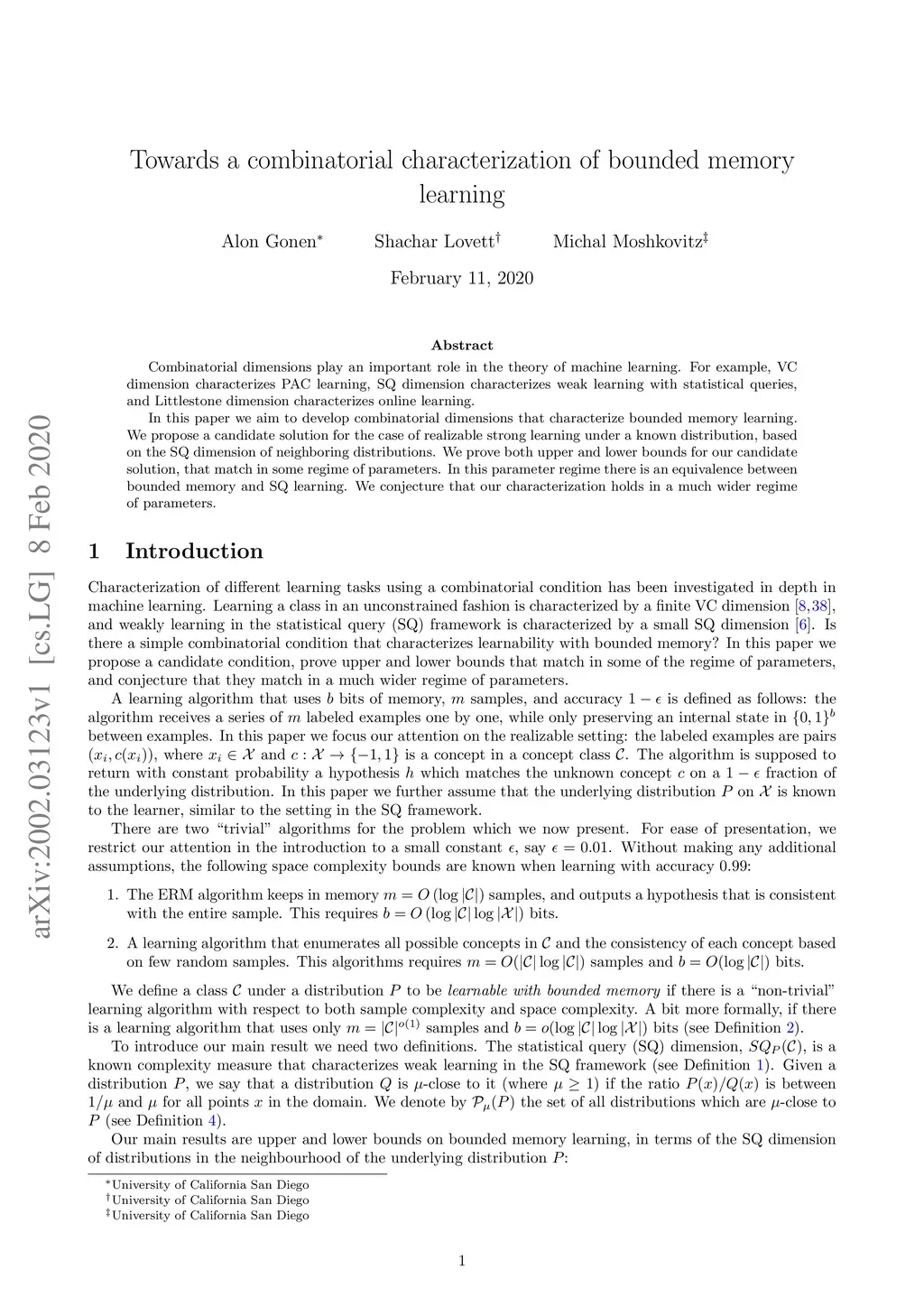 Combinatorial dimensions play an important role in the theory of machine learning. For example, VC dimension characterizes PAC learning, SQ dimension characterizes weak learning with statistical queries, and Littlestone dimension characterizes online learning. In this paper we aim to develop combinatorial dimensions that characterize bounded memory learning. We propose a candidate solution for the case of realizable strong learning under a known distribution, based on the SQ dimension of neighboring distributions. We prove both upper and lower bounds for our candidate solution, that match in some regime of parameters. In this parameter regime there is an equivalence between bounded memory and SQ learning. We conjecture that our characterization holds in a much wider regime of parameters.