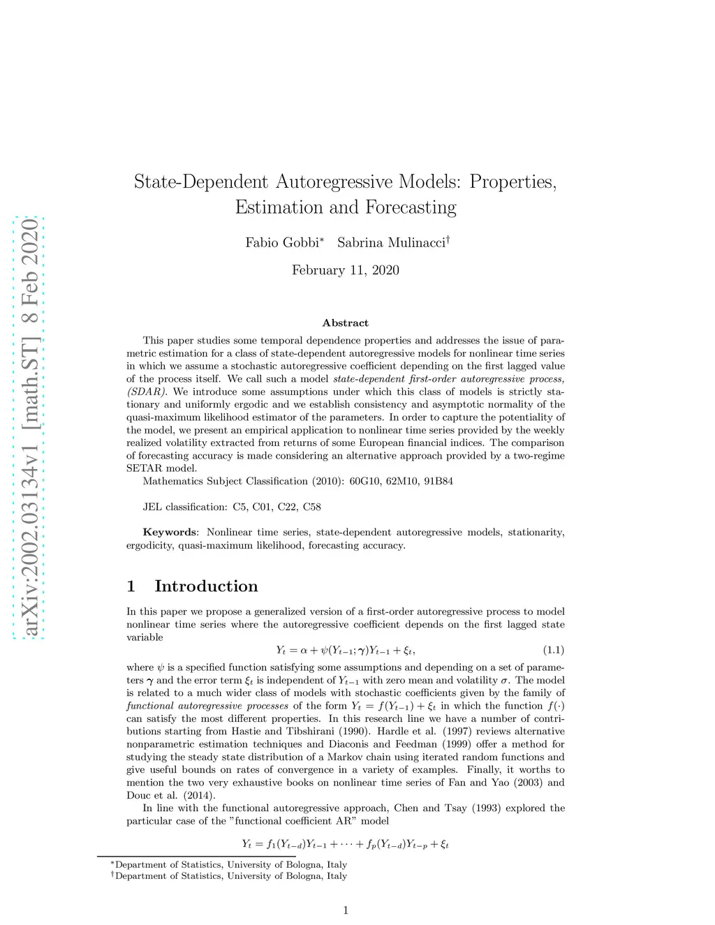 This paper studies some temporal dependence properties and addresses the issue of parametric estimation for a class of state-dependent autoregressive models for nonlinear time series in which we assume a stochastic autoregressive coefficient depending on the first lagged value of the process itself. We call such a model state-dependent first-order autoregressive process, (SDAR). We introduce some assumptions under which this class of models is strictly stationary and uniformly ergodic and we establish consistency and asymptotic normality of the quasi-maximum likelihood estimator of the parameters. In order to capture the potentiality of the model, we present an empirical application to nonlinear time series provided by the weekly realized volatility extracted from returns of some European financial indices. The comparison of forecasting accuracy is made considering an alternative approach provided by a two-regime SETAR model