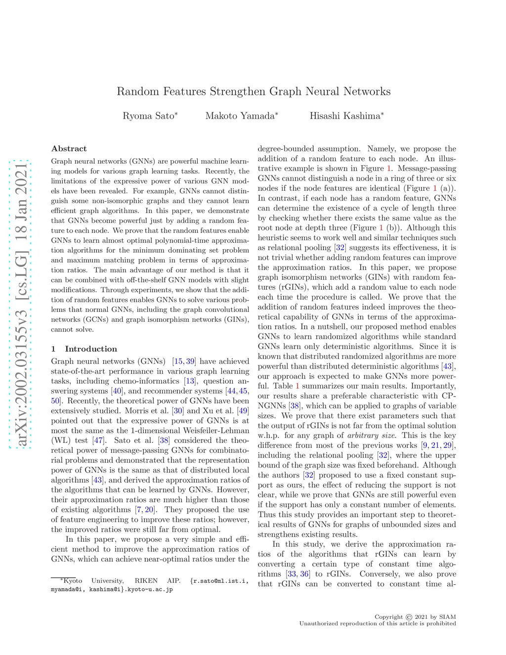 Graph neural networks (GNNs) are powerful machine learning models for various graph learning tasks. Recently, the limitations of the expressive power of various GNN models have been revealed. For example, GNNs cannot distinguish some non-isomorphic graphs and they cannot learn efficient graph algorithms. In this paper, we demonstrate that GNNs become powerful just by adding a random feature to each node. We prove that the random features enable GNNs to learn almost optimal polynomial-time approximation algorithms for the minimum dominating set problem and maximum matching problem in terms of approximation ratios. The main advantage of our method is that it can be combined with off-the-shelf GNN models with slight modifications. Through experiments, we show that the addition of random features enables GNNs to solve various problems that normal GNNs, including the graph convolutional networks (GCNs) and graph isomorphism networks (GINs), cannot solve.