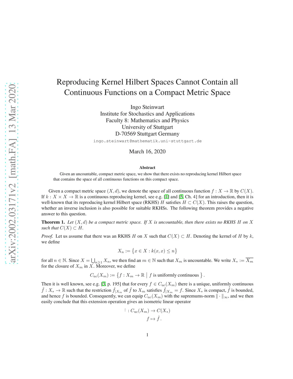Given an uncountable, compact metric space, we show that there exists no reproducing kernel Hilbert space that contains the space of all continuous functions on this compact space.