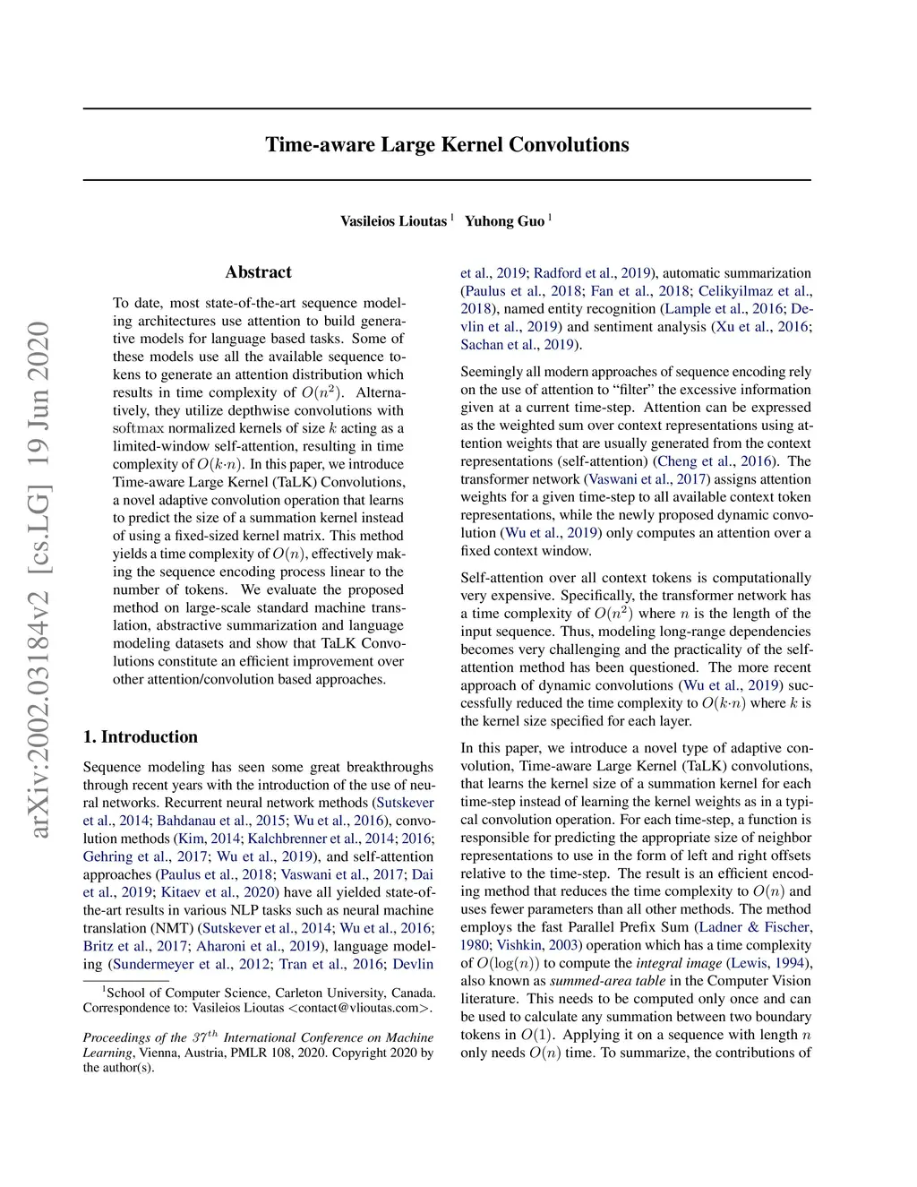 To date, most state-of-the-art sequence modeling architectures use attention to build generative models for language based tasks. Some of these models use all the available sequence tokens to generate an attention distribution which results in time complexity of . Alternatively, they utilize depthwise convolutions with softmax normalized kernels of size acting as a limited-window self-attention, resulting in time complexity of . In this paper, we introduce Time-aware Large Kernel (TaLK) Convolutions, a novel adaptive convolution operation that learns to predict the size of a summation kernel instead of using a fixed-sized kernel matrix. This method yields a time complexity of , effectively making the sequence encoding process linear to the number of tokens. We evaluate the proposed method on large-scale standard machine translation, abstractive summarization and language modeling datasets and show that TaLK Convolutions constitute an efficient improvement over other attention/convolution based approaches.