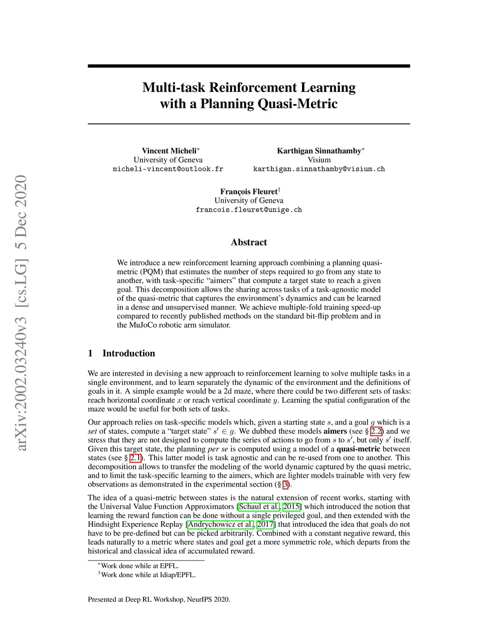 We introduce a new reinforcement learning approach combining a planning quasi-metric (PQM) that estimates the number of steps required to go from any state to another, with task-specific "aimers" that compute a target state to reach a given goal. This decomposition allows the sharing across tasks of a task-agnostic model of the quasi-metric that captures the environment's dynamics and can be learned in a dense and unsupervised manner. We achieve multiple-fold training speed-up compared to recently published methods on the standard bit-flip problem and in the MuJoCo robotic arm simulator.
