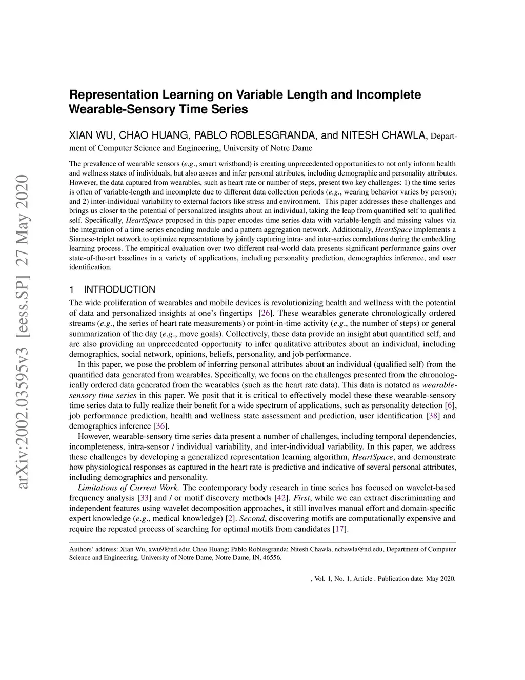The prevalence of wearable sensors (e.g., smart wristband) is creating unprecedented opportunities to not only inform health and wellness states of individuals, but also assess and infer personal attributes, including demographic and personality attributes. However, the data captured from wearables, such as heart rate or number of steps, present two key challenges: 1) the time series is often of variable-length and incomplete due to different data collection periods (e.g., wearing behavior varies by person); and 2) inter-individual variability to external factors like stress and environment. This paper addresses these challenges and brings us closer to the potential of personalized insights about an individual, taking the leap from quantified self to qualified self. Specifically, HeartSpace proposed in this paper encodes time series data with variable-length and missing values via the integration of a time series encoding module and a pattern aggregation network. Additionally, HeartSpace implements a Siamese-triplet network to optimize representations by jointly capturing intra- and inter-series correlations during the embedding learning process. The empirical evaluation over two different real-world data presents significant performance gains overstate-of-the-art baselines in a variety of applications, including personality prediction, demographics inference, and user identification.