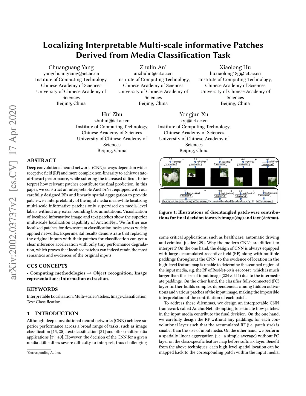 Deep convolutional neural networks (CNN) always depend on wider receptive field (RF) and more complex non-linearity to achieve state-of-the-art performance, while suffering the increased difficult to interpret how relevant patches contribute the final prediction. In this paper, we construct an interpretable AnchorNet equipped with our carefully designed RFs and linearly spatial aggregation to provide patch-wise interpretability of the input media meanwhile localizing multi-scale informative patches only supervised on media-level labels without any extra bounding box annotations. Visualization of localized informative image and text patches show the superior multi-scale localization capability of AnchorNet. We further use localized patches for downstream classification tasks across widely applied networks. Experimental results demonstrate that replacing the original inputs with their patches for classification can get a clear inference acceleration with only tiny performance degradation, which proves that localized patches can indeed retain the most semantics and evidences of the original inputs.
