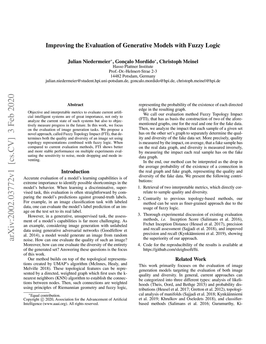 Objective and interpretable metrics to evaluate current artificial intelligent systems are of great importance, not only to analyze the current state of such systems but also to objectively measure progress in the future. In this work, we focus on the evaluation of image generation tasks. We propose a novel approach, called Fuzzy Topology Impact (FTI), that determines both the quality and diversity of an image set using topology representations combined with fuzzy logic. When compared to current evaluation methods, FTI shows better and more stable performance on multiple experiments evaluating the sensitivity to noise, mode dropping and mode inventing.