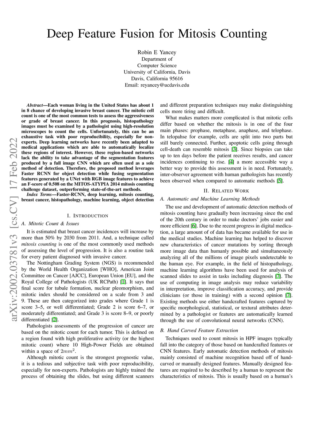 Each woman living in the United States has about 1 in 8 chance of developing invasive breast cancer. The mitotic cell count is one of the most common tests to assess the aggressiveness or grade of breast cancer. In this prognosis, histopathology images must be examined by a pathologist using high-resolution microscopes to count the cells. Unfortunately, can be an exhaustive task with poor reproducibility, especially for non-experts. Deep learning networks have recently been adapted to medical applications which are able to automatically localize these regions of interest. However, these region-based networks lack the ability to take advantage of the segmentation features produced by a full image CNN which are often used as a sole method of detection. Therefore, the proposed method leverages Faster RCNN for object detection while fusing segmentation features generated by a UNet with RGB image features to achieve an F-score of 0.508 on the MITOS-ATYPIA 2014 mitosis counting challenge dataset, outperforming state-of-the-art methods.