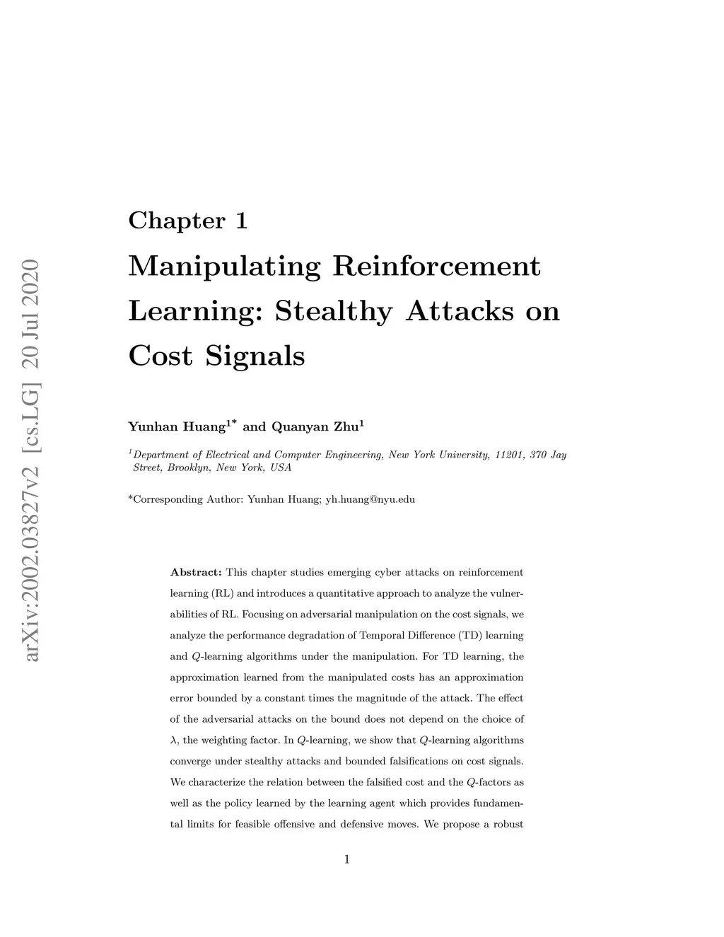 This chapter studies emerging cyber-attacks on reinforcement learning (RL) and introduces a quantitative approach to analyze the vulnerabilities of RL. Focusing on adversarial manipulation on the cost signals, we analyze the performance degradation of TD() and -learning algorithms under the manipulation. For TD(), the approximation learned from the manipulated costs has an approximation error bound proportional to the magnitude of the attack. The effect of the adversarial attacks on the bound does not depend on the choice of . In -learning, we show that -learning algorithms converge under stealthy attacks and bounded falsifications on cost signals. We characterize the relation between the falsified cost and the -factors as well as the policy learned by the learning agent which provides fundamental limits for feasible offensive and defensive moves. We propose a robust region in terms of the cost within which the adversary can never achieve the targeted policy. We provide conditions on the falsified cost which can mislead the agent to learn an adversary's favored policy. A case study of TD() learning is provided to corroborate the results.