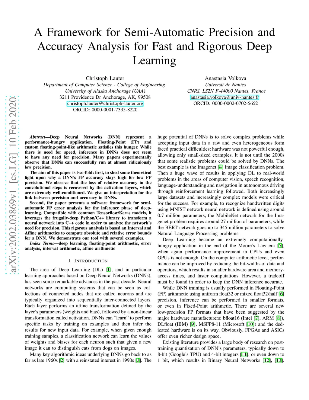 Deep Neural Networks (DNN) represent a performance-hungry application. Floating-Point (FP) and custom floating-point-like arithmetic satisfies this hunger. While there is need for speed, inference in DNNs does not seem to have any need for precision. Many papers experimentally observe that DNNs can successfully run at almost ridiculously low precision. The aim of this paper is two-fold: first, to shed some theoretical light upon why a DNN's FP accuracy stays high for low FP precision. We observe that the loss of relative accuracy in the convolutional steps is recovered by the activation layers, which are extremely well-conditioned. We give an interpretation for the link between precision and accuracy in DNNs. Second, the paper presents a software framework for semi-automatic FP error analysis for the inference phase of deep-learning. Compatible with common Tensorflow/Keras models, it leverages the frugally-deep Python/C++ library to transform a neural network into C++ code in order to analyze the network's need for precision. This rigorous analysis is based on Interval and Affine arithmetics to compute absolute and relative error bounds for a DNN. We demonstrate our tool with several examples.