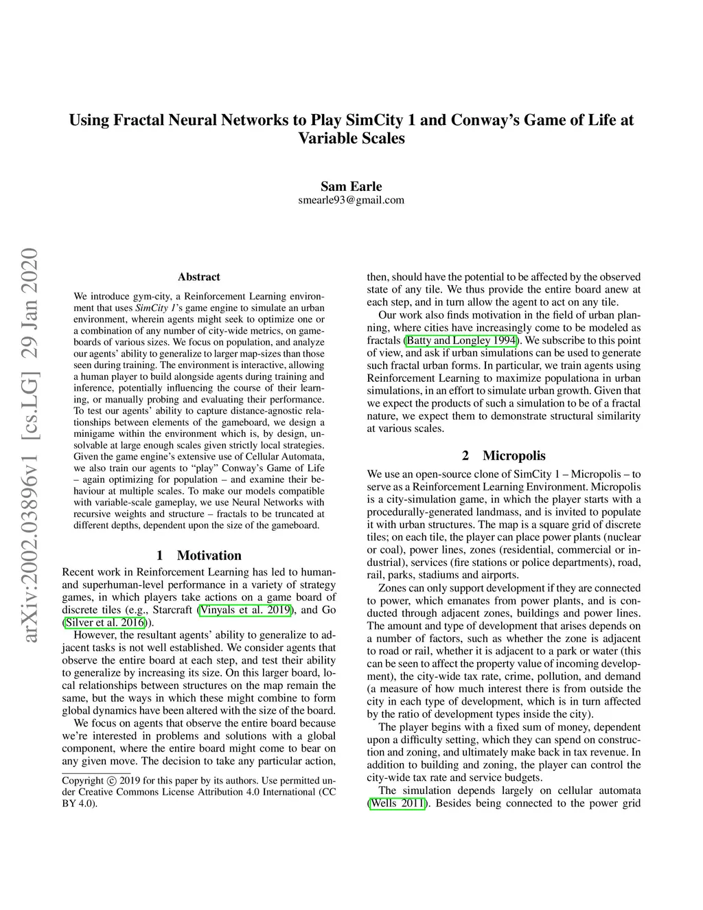 We introduce gym-city, a Reinforcement Learning environment that uses SimCity 1's game engine to simulate an urban environment, wherein agents might seek to optimize one or a combination of any number of city-wide metrics, on gameboards of various sizes. We focus on population, and analyze our agents' ability to generalize to larger map-sizes than those seen during training. The environment is interactive, allowing a human player to build alongside agents during training and inference, potentially influencing the course of their learning, or manually probing and evaluating their performance. To test our agents' ability to capture distance-agnostic relationships between elements of the gameboard, we design a minigame within the environment which is, by design, unsolvable at large enough scales given strictly local strategies. Given the game engine's extensive use of Cellular Automata, we also train our agents to "play" Conway's Game of Life -- again optimizing for population -- and examine their behaviour at multiple scales. To make our models compatible with variable-scale gameplay, we use Neural Networks with recursive weights and structure -- fractals to be truncated at different depths, dependent upon the size of the gameboard.