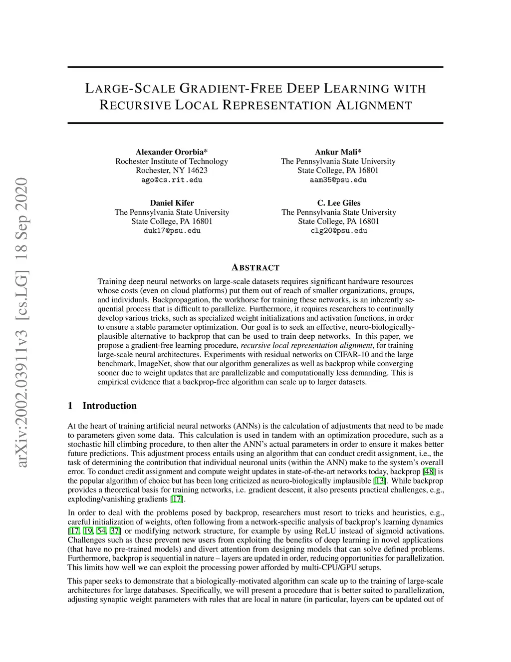 Training deep neural networks on large-scale datasets requires significant hardware resources whose costs (even on cloud platforms) put them out of reach of smaller organizations, groups, and individuals. Backpropagation, the workhorse for training these networks, is an inherently sequential process that is difficult to parallelize. Furthermore, it requires researchers to continually develop various tricks, such as specialized weight initializations and activation functions, in order to ensure a stable parameter optimization. Our goal is to seek an effective, neuro-biologically-plausible alternative to backprop that can be used to train deep networks. In this paper, we propose a gradient-free learning procedure, recursive local representation alignment, for training large-scale neural architectures. Experiments with residual networks on CIFAR-10 and the large benchmark, ImageNet, show that our algorithm generalizes as well as backprop while converging sooner due to weight updates that are parallelizable and computationally less demanding. This is empirical evidence that a backprop-free algorithm can scale up to larger datasets.